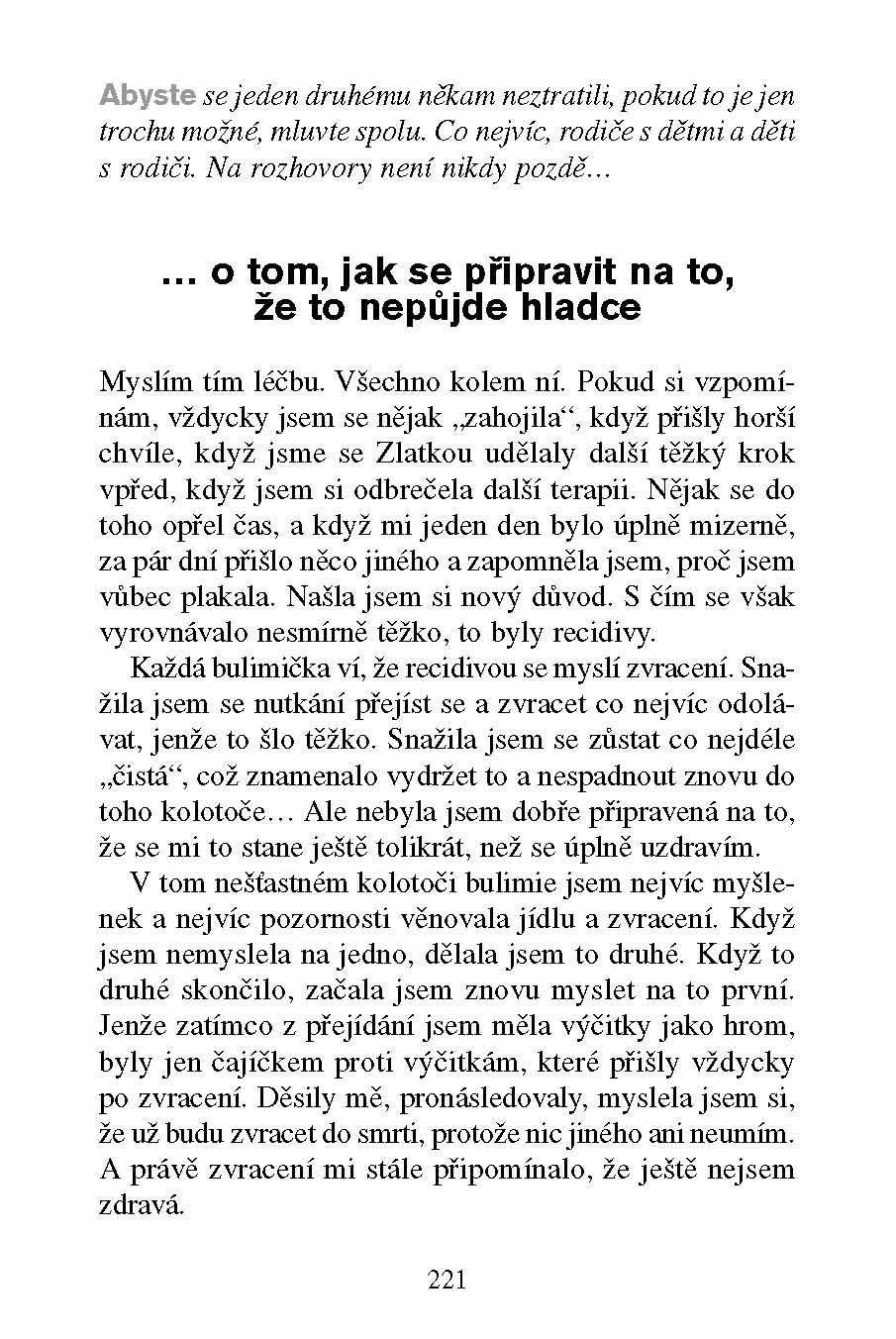 Diagnóza F50 souhrnně označuje poruchy příjmu potravy, kterými dnes trpí mnoho žen, a dokonce i dětí. Novinářka Gabina Weissová je jednou z nich: bez obalu vypráví o své anorektické a bulimické minulosti: o tom, jak do toho spadla, o tom, jak hladověla, o tom, jak do sebe cpala cokoli – od strouhanky až po syrové špagety, aby ze sebe vzápětí všechno zase dostala ven. Otevřeně píše o pobytu na psychiatrickém oddělení nemocnice, o lásce, pro kterou se vzchopila, a o dětech, které jí nakonec zachránily život.