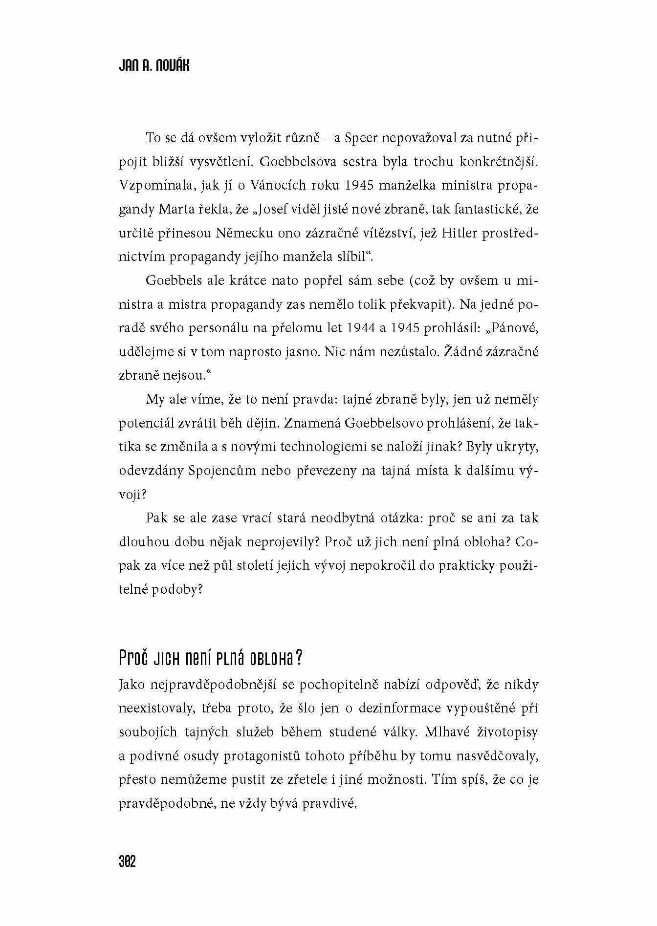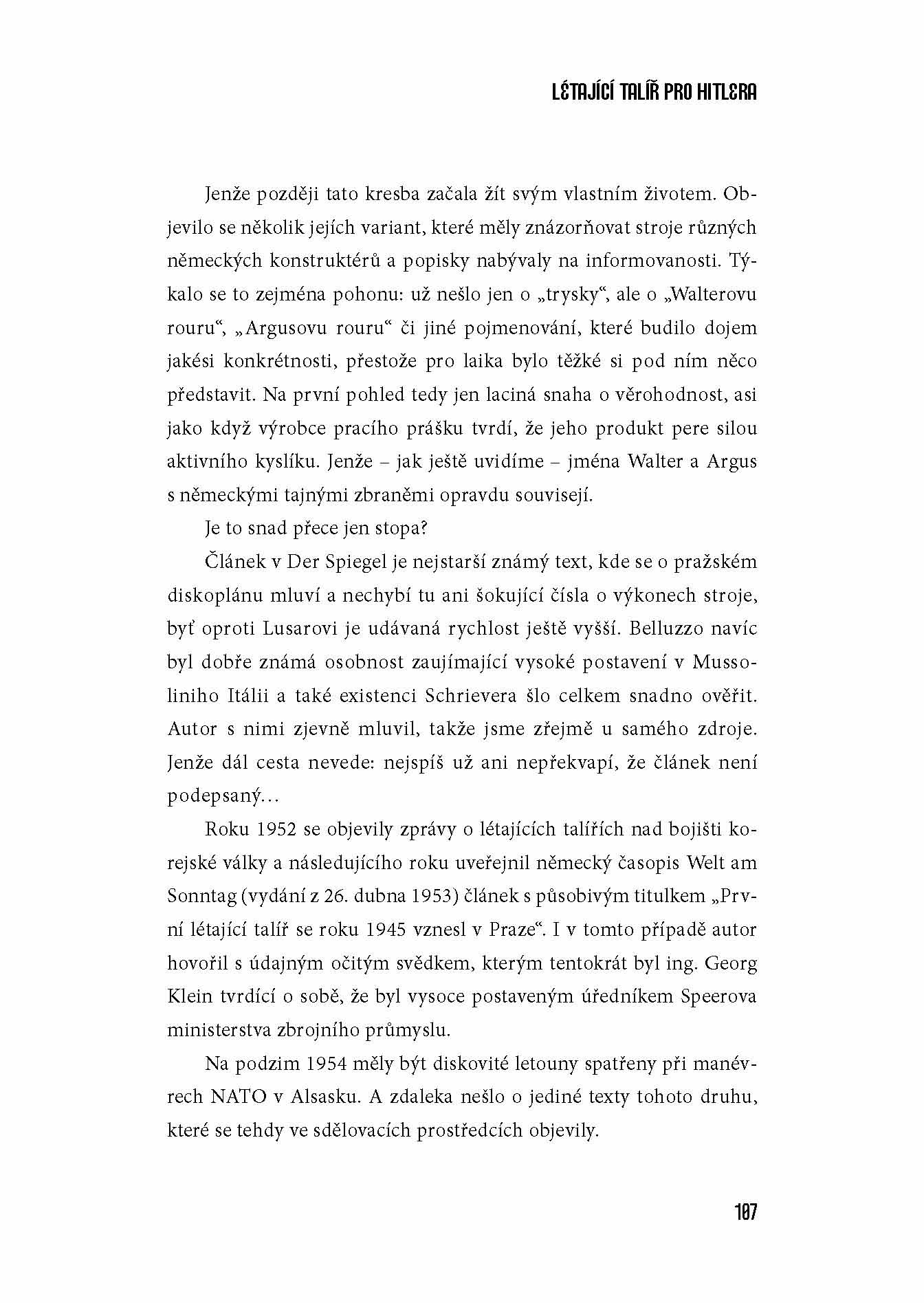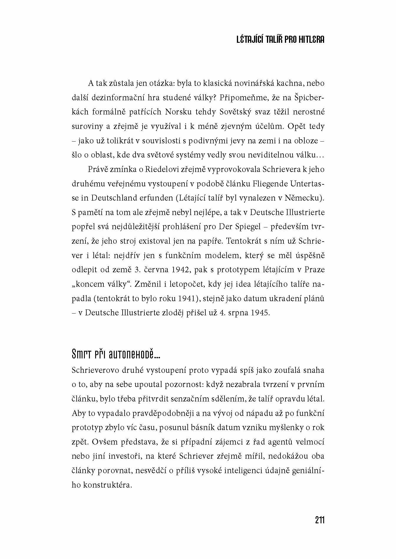 Hitlerovy tajné zbraně jsou dodnes záhadou, o níž se vedou vleklé spory. Některé jsou zřetelným dokladem toho, že myšlení nacistických konstruktérů se ubíralo velmi neobvyklými cestami. Jiné, ještě podivnější zbraně se teprve rodily v konstrukčních kancelářích a prototypových dílnách. K nejtajemnějším případům pak patří pověst o diskoplánech - létajících talířích mimořádných výkonů, jejichž vývoj, a dokonce i výroba a letové zkoušky se měly odehrávat z největší části na území Čech, v blízkém okolí Prahy.