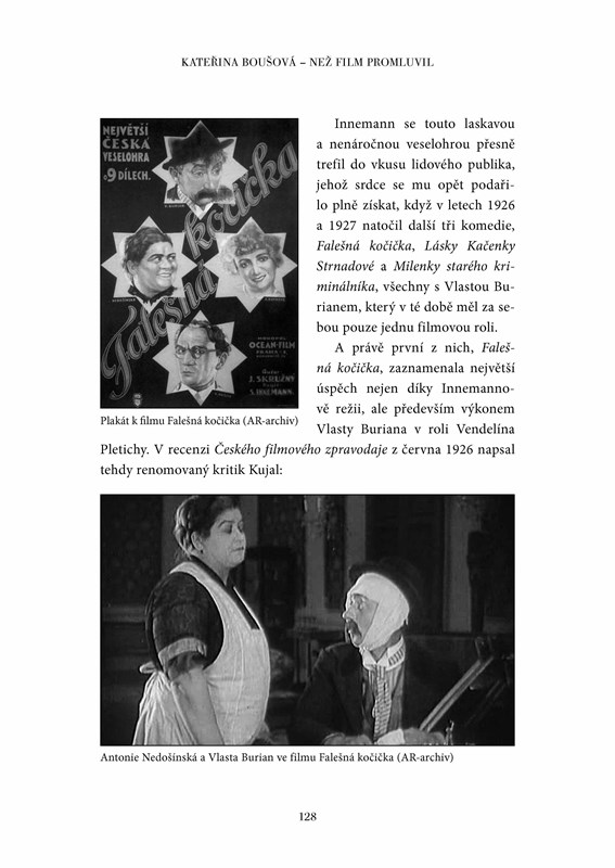 Výpravná publikace o němé éře československého filmu přináší portréty největších osobností naší filmové tvorby období od přelomu století až do r. 1931, kdy slavná éra skončila vystavěním barrandovských ateliérů, které znamenaly zase novou revoluci ve filmu. Herecké hvězdy Anny Ondráková, Suzanne Marville, Jan S. Kolár, Theodor Pištěk, Jindřich Plachta, Josef Šváb-Malostranský, Antonie Nedošinská, režisérské osobnosti jako Karel Lamač, Mac Frič, Gustav Machatý ad. se nesmazatelně zapsaly do naší filmové historie. Jaké byly jejich životní a profesní osudy a jak na ně vzpomínali jejich kolegové z branže? O cestě od prvního kinematografu k první filmové společnosti, o tom, jak vypadal celý filmový provoz, o osudech prvních biografů a mnoho dalších informací přináší desítkami fotografií, citacemi z dobového tisku a rozhovory opatřená kniha Kateřiny Boušové. Autorka se dlouhodobě věnuje divadelní kritice, dějinám filmu a psaní pohádek a dramatizací.