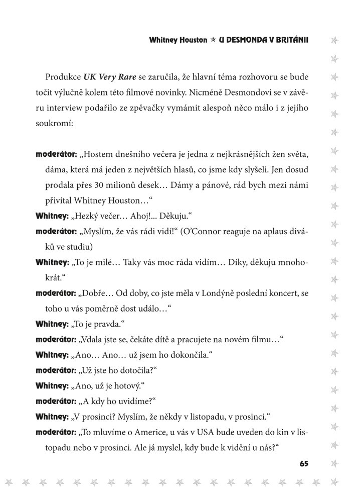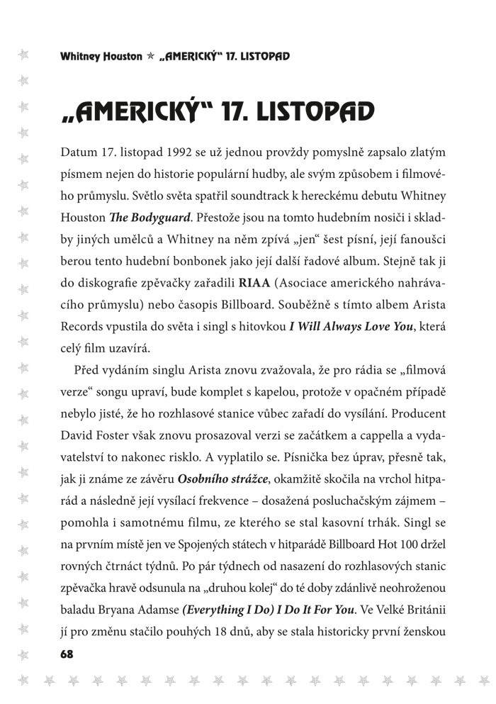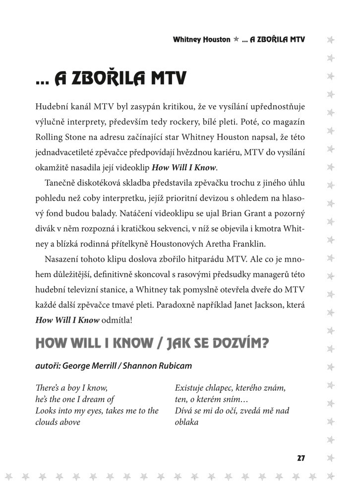 Whitney Houston – fenomenální zpěvačka, která svou životní pouť zakončila v únoru 2012. Zpráva o její nečekaně smrti obletěla celý svět a zaskočila každého. Nahlédněte spolu s námi za oslnivá světla hudebních pódií, do nelehkého zákulisí života této jedinečné zpěvačky. Kniha popisuje její život od počátků pěvecké kariéry v dětství přes její vrchol v období filmu Osobní strážce až po sestup a osobní problémy s drogami, které řešila v manželství s Bobbym Brownem. Publikace obsahuje mimo jiné řadu jejích rozhovorů, které vznikaly v průběhu několika let a ve kterých sama komentuje stěžejní chvíle svého života.