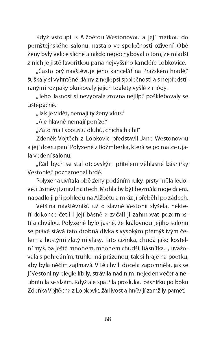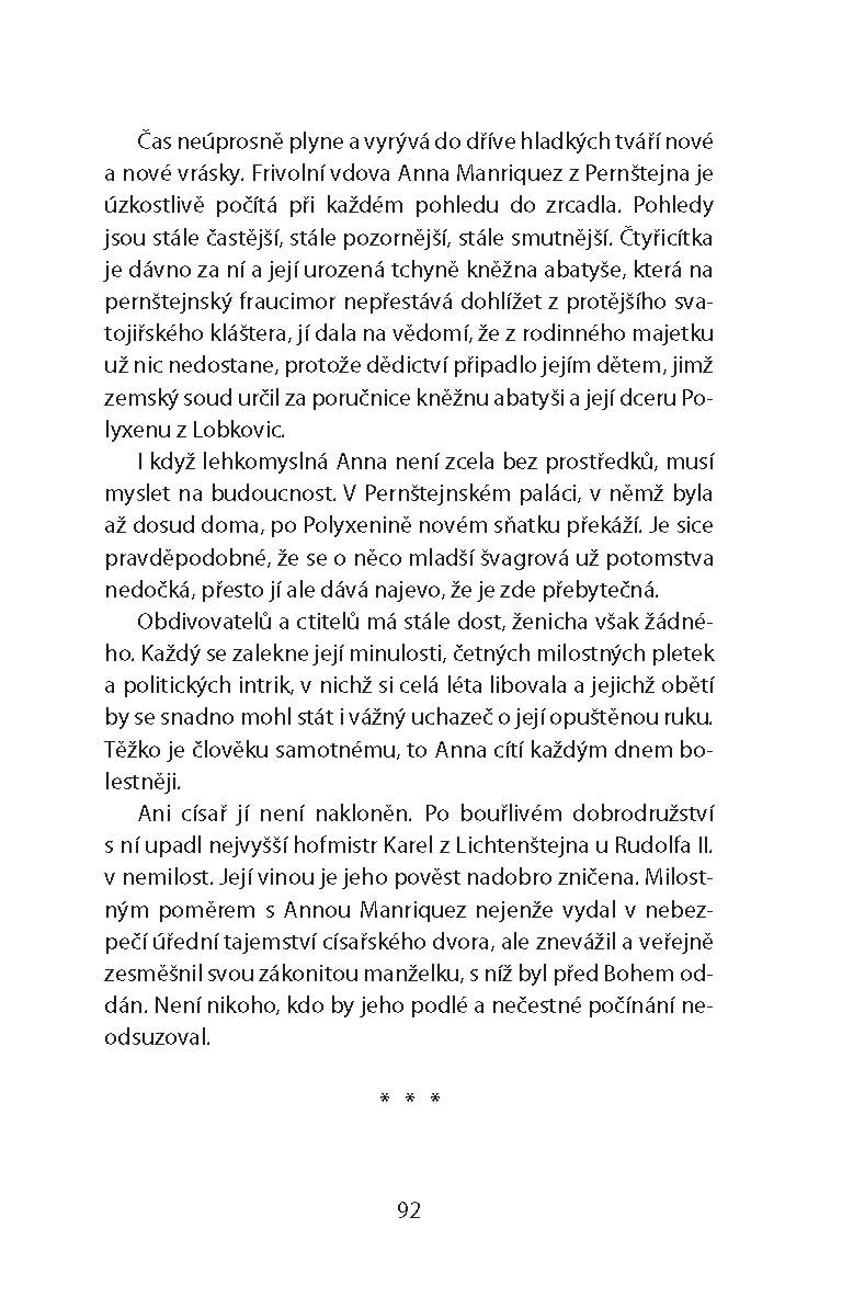 Na pozadí historických událostí z přelomu šestnáctého a sedmnáctého století vypráví autorka životní příběh krásné Polyxeny z Pernštejna, nekorunované královny na dvoře Rudolfa II. Z jeho vůle se poprvé provdala za jihočeského šlechtice a rodinného přítele Viléma z Rožmberka, muže o hodně staršího, který ji miloval spíše jako dceru než manželku. Po jeho smrti se Polyxena nevyhýbala milostným dobrodružstvím, prožila vášnivou lásku s nekatolíkem Jindřichem Matyášem z Thurnu a nakonec se provdala za zarytého katolíka Zdeňka Vojtěcha z Lobkovic. Sňatek to byl zprvu politický, ale vyvinula se z něj nakonec hluboká láska. Jen na dítě čekala Polyxena dlouho marně. Za třicetileté války se do Prahy nakrátko vrátil i Jindřich Matyáš z Thurnu a oba dávní milenci se po letech odloučení znovu setkali…