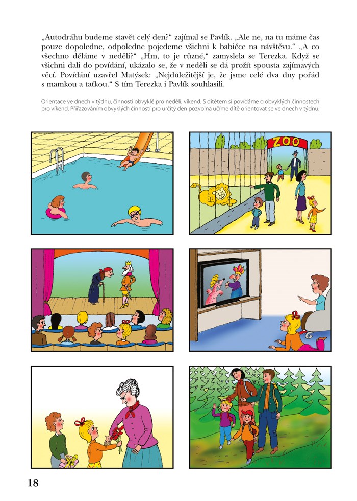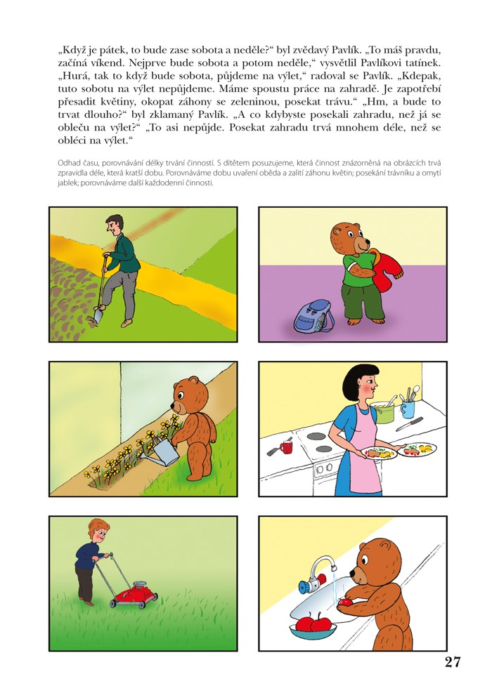 Jistě mi dáte za pravdu, že i pro nás dospělé je důležité cítit se dobře mezi ostatními lidmi. To znamená umět se orientovat v nových podmínkách, vztazích, dokázat si zorganizovat práci, být dochvilný. Když se nám to daří, cítíme se úspěšní, spokojení v rodině, v práci, ve sportu. A to vše potřebuje i dítě, aby bylo ve škole šťastné a mohlo se dobře učit: je to součást takzvané školní zralosti. Dobrá orientace v čase a prostoru ovlivňuje sociální a citové vyzrávání dítěte a přispívá k jeho odolnosti vůči školní zátěži. Významným faktorem při rozvíjení orientace v čase a prostoru je samozřejmě rozvoj zrakového a sluchového vnímání spolu s cvičením obratnosti vedoucí ruky, kterou dítě píše. A v neposlední řadě je to také komunikace, řeč dítěte, tedy jeho schopnost formulovat svá přání, dokázat vyjádřit, co ví, co umí. Pro spokojenost začínajícího školáka je důležité, aby se uměl domluvit s učitelem, se spolužáky. Dítě potřebuje rozumět tomu, když se řekne dopoledne, který měsíc následuje po září, co je od nás vpravo či vlevo, co je zcela vpředu nebo vzadu, a také které jevy v přírodě provázejí například jarní měsíce.