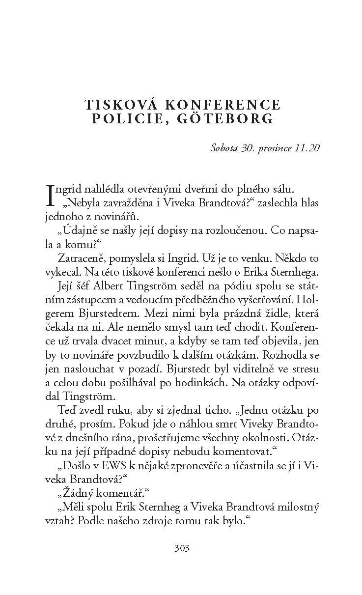 Těsně před Vánocemi je v koupelně své luxusní vily nalezen zavražděný slavný podnikatel Erik W. Sternheg. Po ohledání místa činu je zřejmé, že ho vrah musel z duše nenávidět. Komisařka Ingrid Bergmanová s povzdechem opouští svůj plán na vytoužené klidné prožití svátků a ujímá se mediálně sledovaného případu. Vyšetřování od začátku komplikuje sněhová kalamita a nedostatek personálu, ale hlavně neochota vyslýchaných cokoli o zavražděném prozradit. Zdánlivě všemi oblíbený příslušník göteborské smetánky skrýval mnohá temná tajemství, která postupně vyplouvají na povrch. Najednou se zdá, že motiv k vraždě měl v jeho okolí kdekdo. Aby toho nebylo na Ingrid málo, zároveň musí pátrat po muži, který soustavně pronásleduje a vydírá její kolegyni Malin. Vše nasvědčuje tomu, že dotyčný stalker je z řad policie. Podaří se Ingrid vyřešit oba případy?