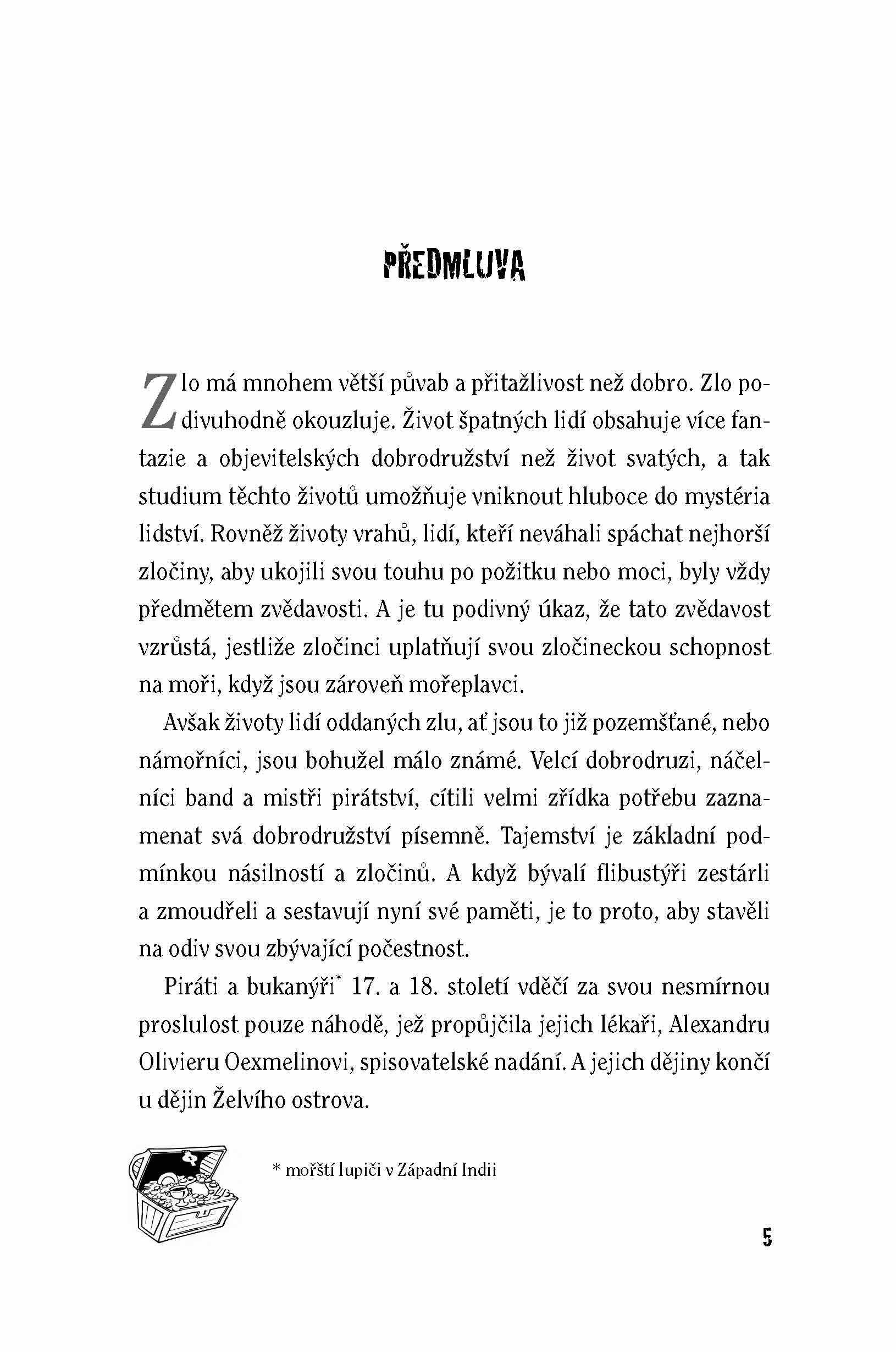 Kolik velkých příběhů a dramat by zůstalo napospas závratné minulosti, kdyby nebylo spisovatelů? A co teprve, když se jedná o pohnuté pirátské osudy. Ty jsou obzvlášť opředeny tajemstvím… Životní příběhy a dobrodružství pirátů a bukanýrů 17. a 18. století sepsal vášnivý dobrodruh a milovník starých cestopisů Maurice Magre v poutavé vyprávění Pirates et Flibustiers (1934). Cenná svědectví o kultuře, mravech a páchaných zločinnostech těchto kriminálníků, a zároveň velkých mořeplavců, čerpal Magre ze starých cestovatelských časopisů a porůznu zapadlých knih francouzských dobrodruhů. V zaujetí pro historickou pravdu je srovnává i s cizími mořeplaveckými legendami. Magre tak zprostředkovává i autory, které by jinak literatura ponechala v zapomnění... ostatně jako i uchvacující a mnohdy děsivý svět pirátů.