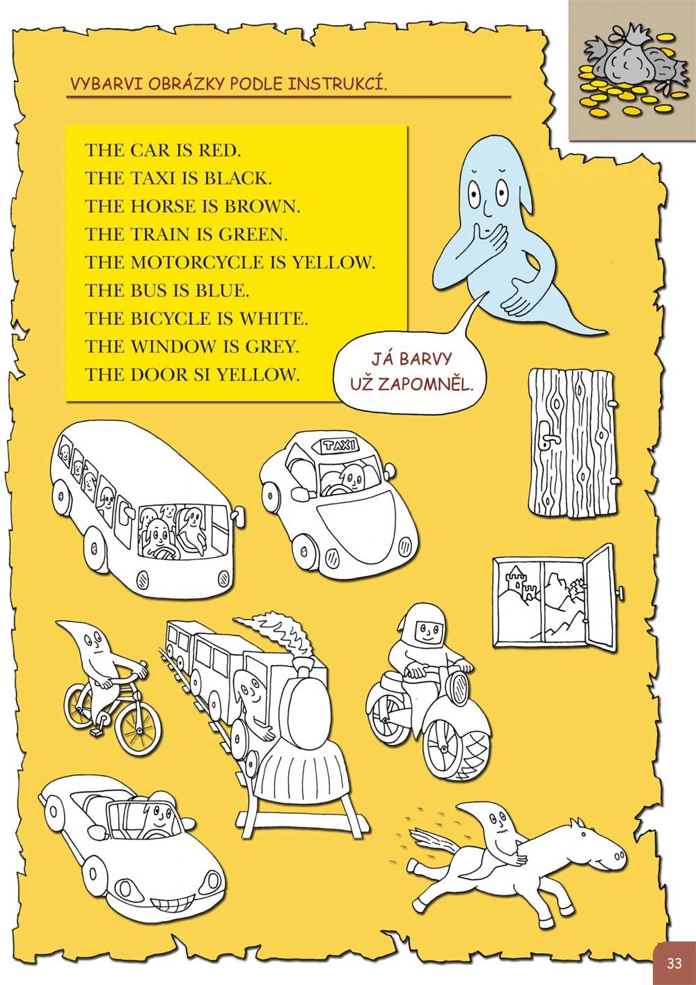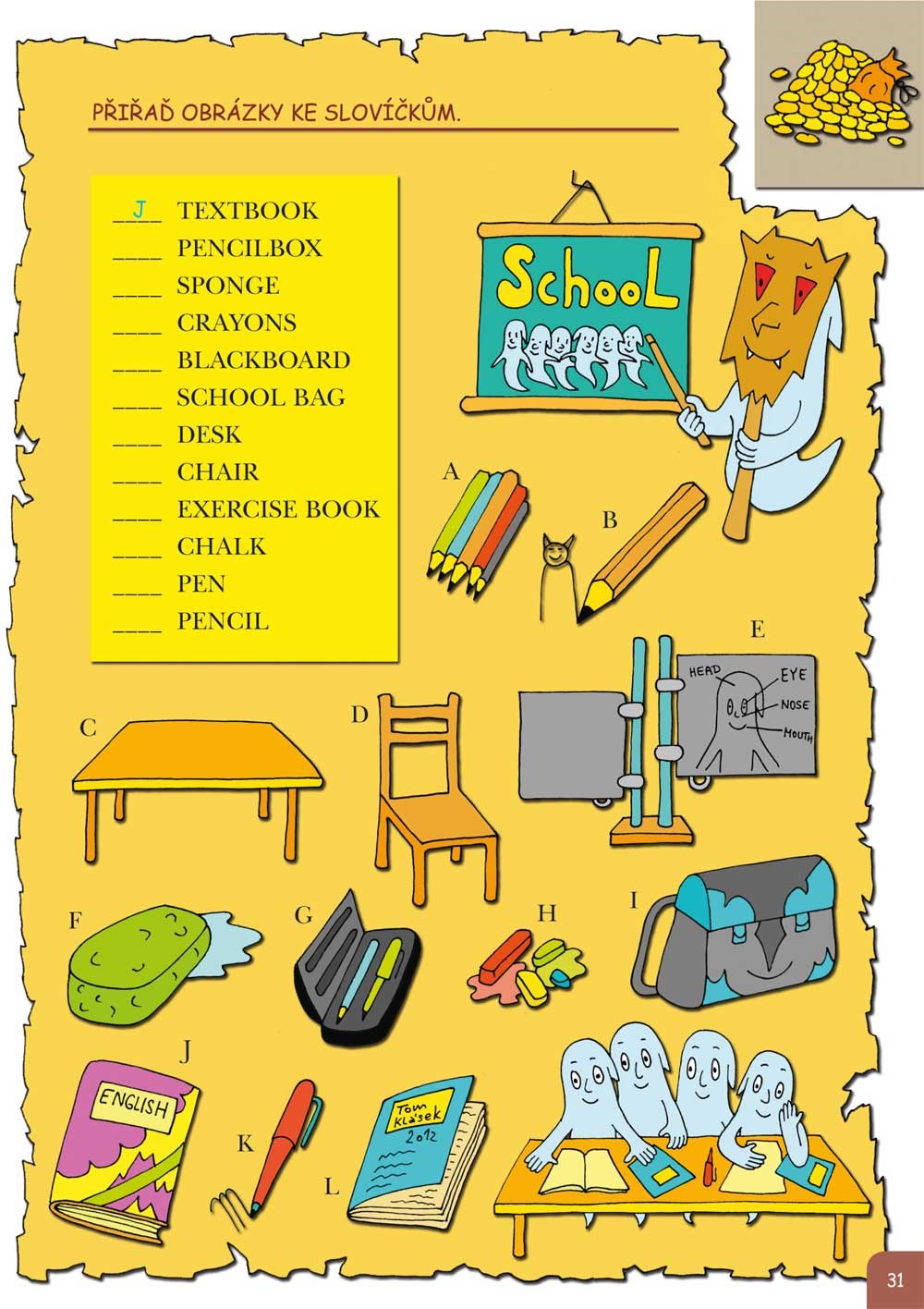Kamarádský duch zavede malé čtenáře na svůj strašidelný hrad, kde každý dostane příležitost splnit rozmanité úkoly a získat drahocenné poklady, které si může lepit do vlastní soukromé pokladnice. Tu je možné z knihy vyjmout. Zábavnou formou se při tom všem procvičí základy gramatiky i slovní zásoba: barvy, čísla, ovoce a zelenina, dopravní prostředky, povolání, dny, hodiny, části lidského těla, oblečení a mnohé další. Kniha je plná názorných, barevných a legračních obrázků.