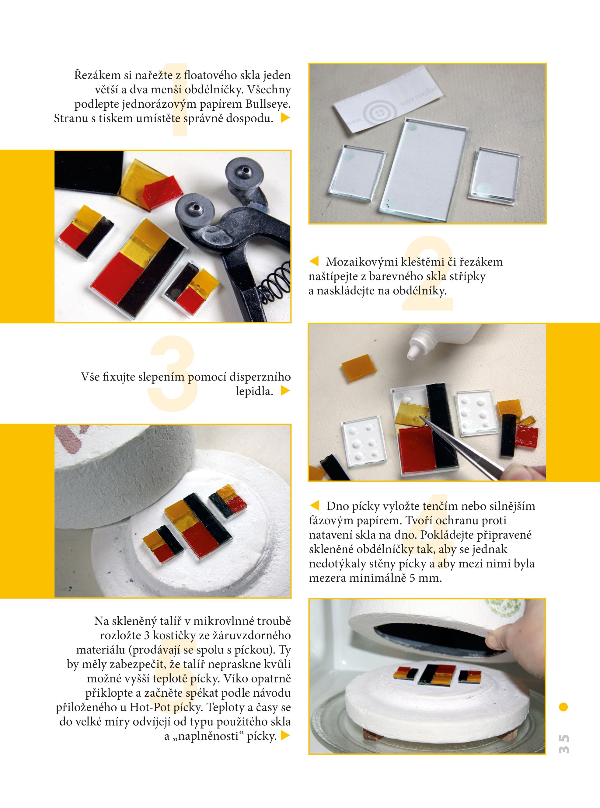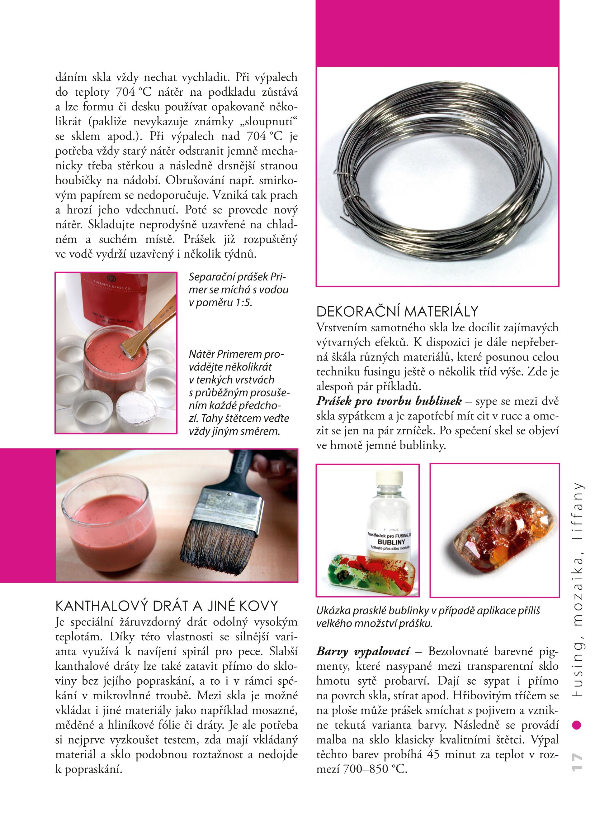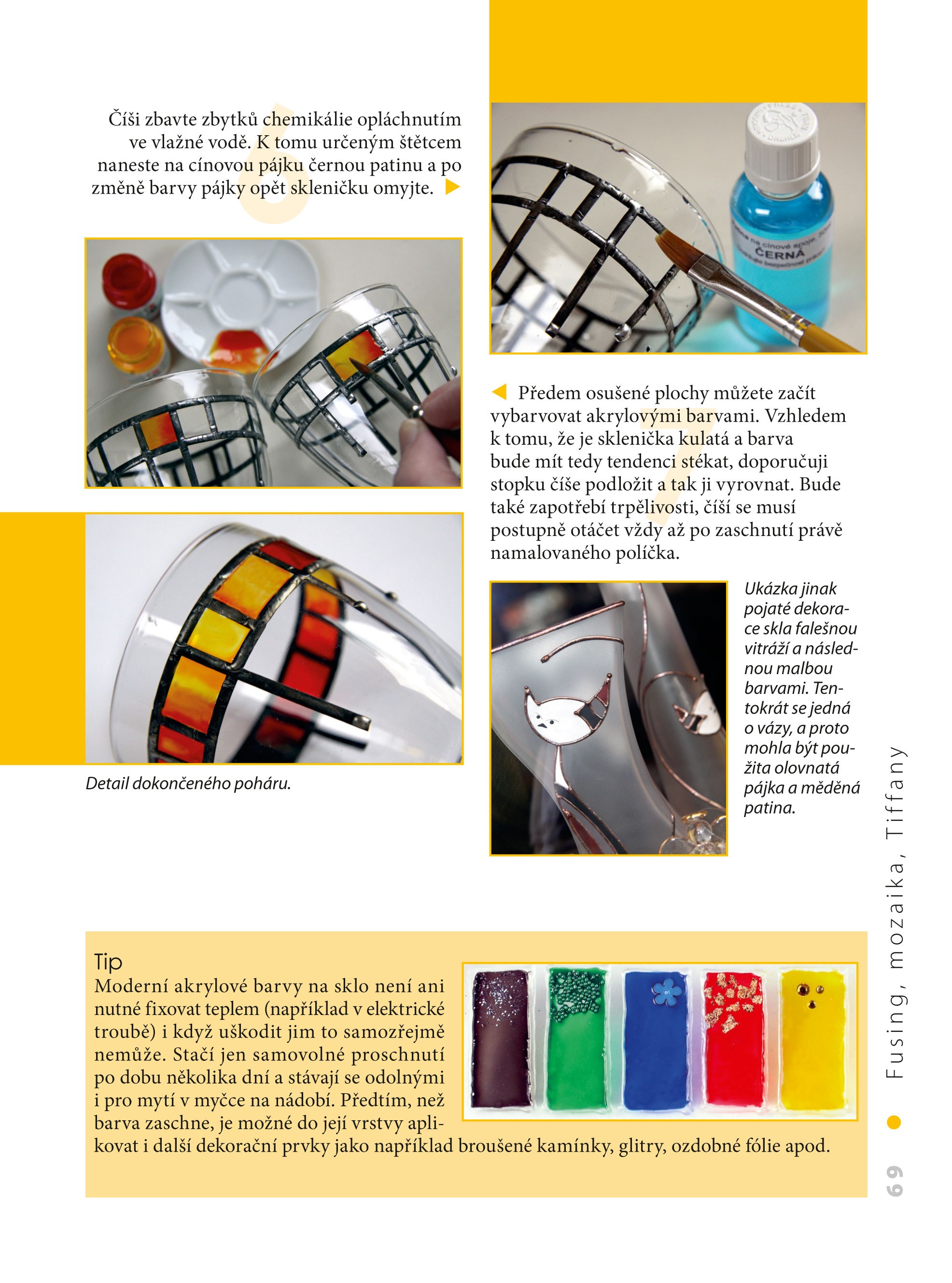 Kniha v sobě elegantně kombinuje tři obsáhlé techniky – fusing, mozaiku a Tiffany vitráž. V projektové části jsou zastoupeny jak jednoduché postupy pro začátečníky (spékání skla v mikrovlnné troubě, mozaika přímá do rámu nebo základy Tiffany na cínovaném šperku), tak i návody na náročnější výrobky (fusing a lehání do forem v klasické peci, mozaika nepřímou metodou na stěnu, panelová stolní lampa a lampa letovaná na formě). Vše doprovází spousta tipů a triků, které lze v uvedených technikách využít.