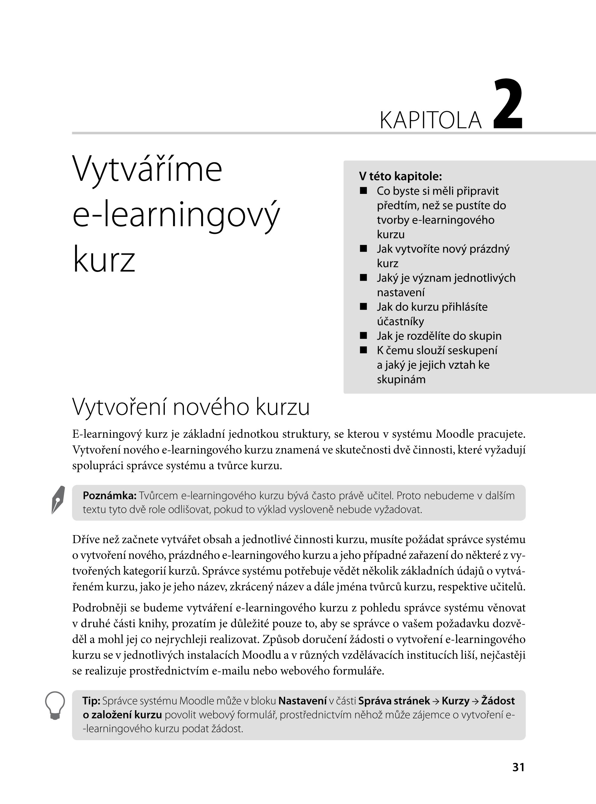 V tomto průvodci, který je vhodný i pro úplné začátečníky, získáte ucelený pohled na možnosti Moodlu. Kniha vyniká metodikou výkladu: nejde o referenční příručku se strohými popisy nastavení, ale o učení se na základě tvorby kompletního e-learningového kurzu, který budete společně s autory vytvářet od začátku až do konce.