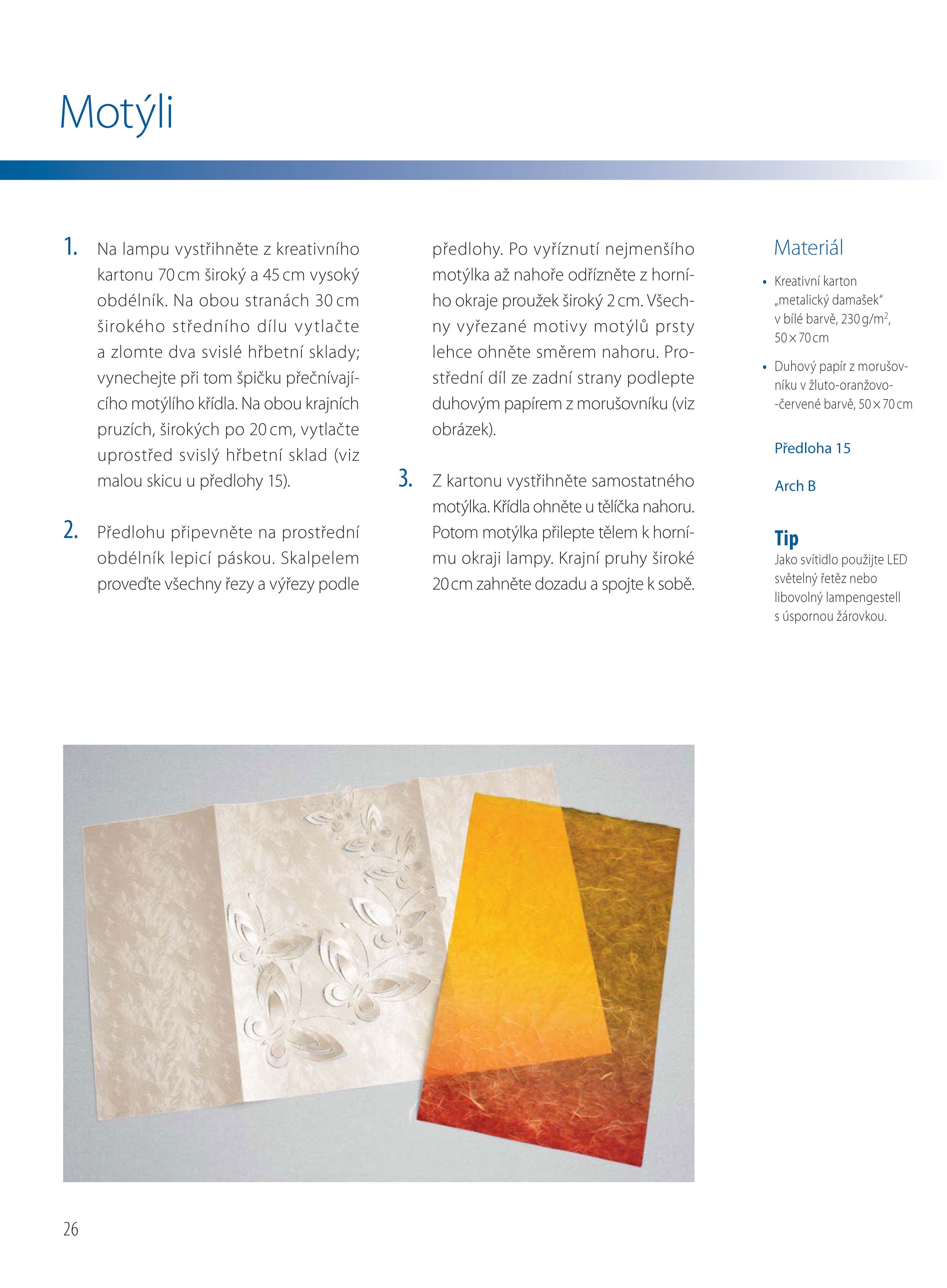 Svítidla tvoří srdce každého pokoje. Jejich světlo dodává akcent, vytváří atmosféru. S pomocí této knihy si nevšední světelné scénáře můžete jednoduše sami vyrobit. Díky kombinaci skládání, řezů a výřezů papíru nebo propojením obou technik do trojrozměrných prvků vznikají mimořádné designy. Styly – elegantní, moderní, hravé nebo retro – jsou přitom stejně rozmanité jako použití stínítek do stolních, stojacích či závěsných svítidel. Některé lampy hrají zvlášť rafinované hry se světlem a vytvářejí tak vzrušující efekty světla a stínů.