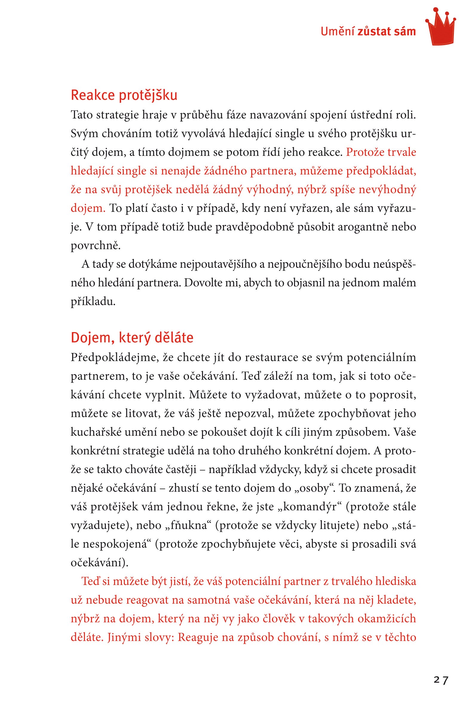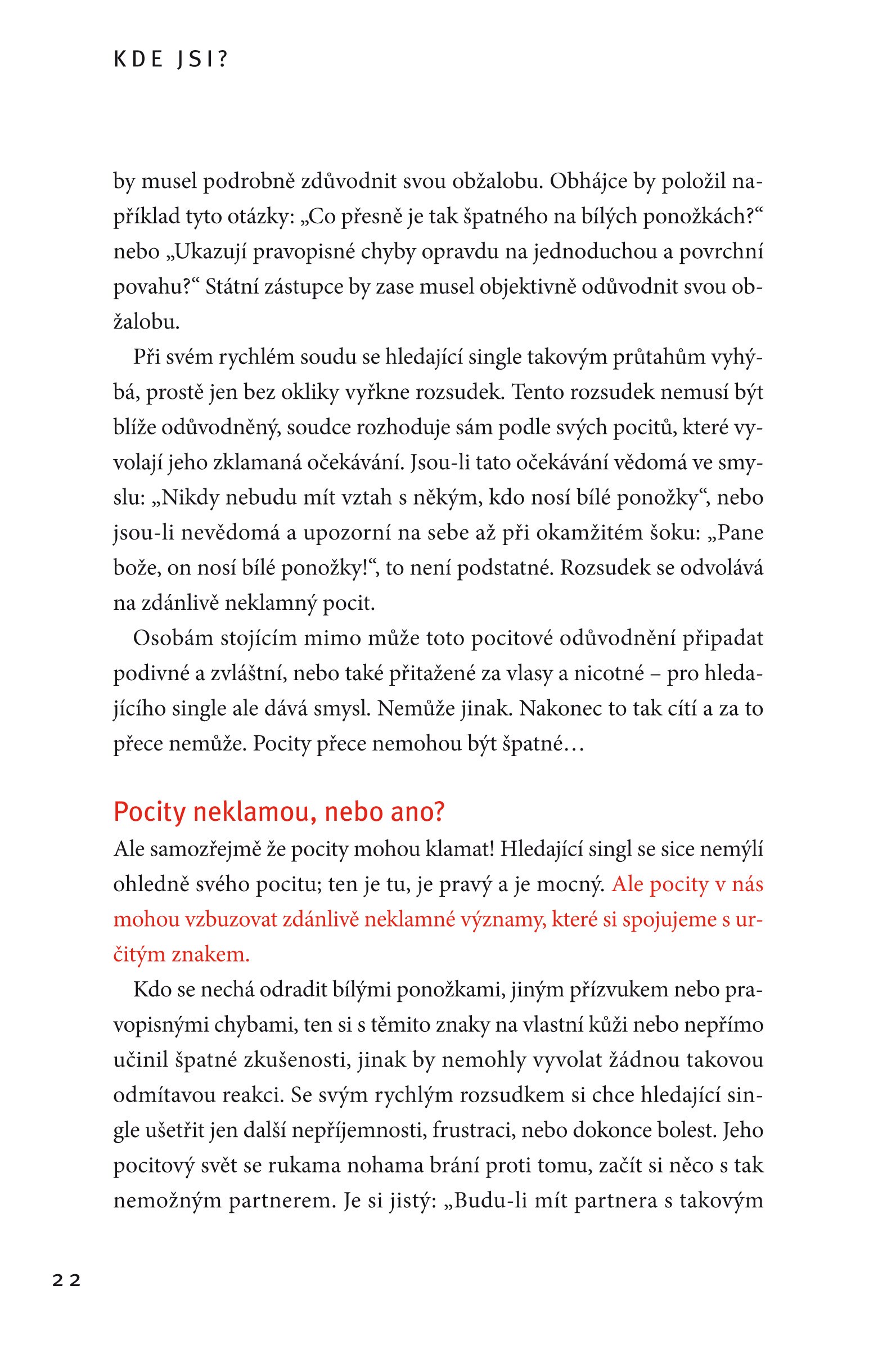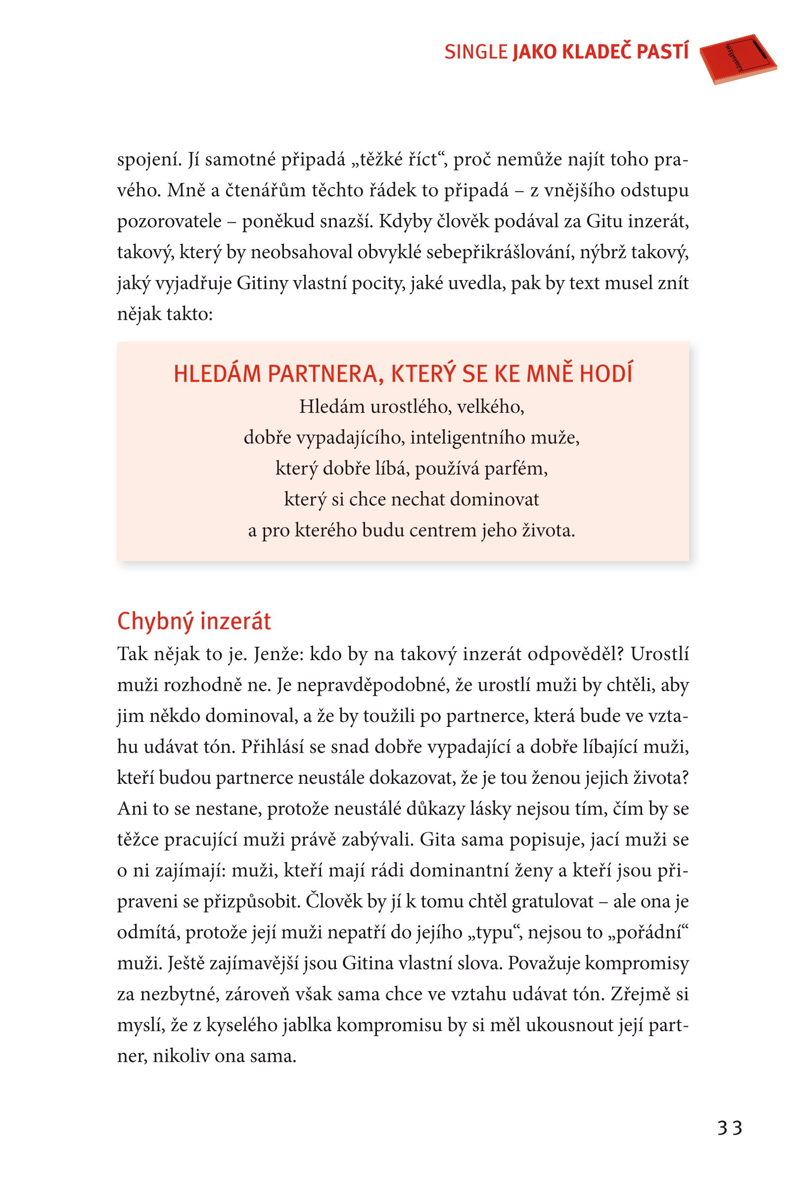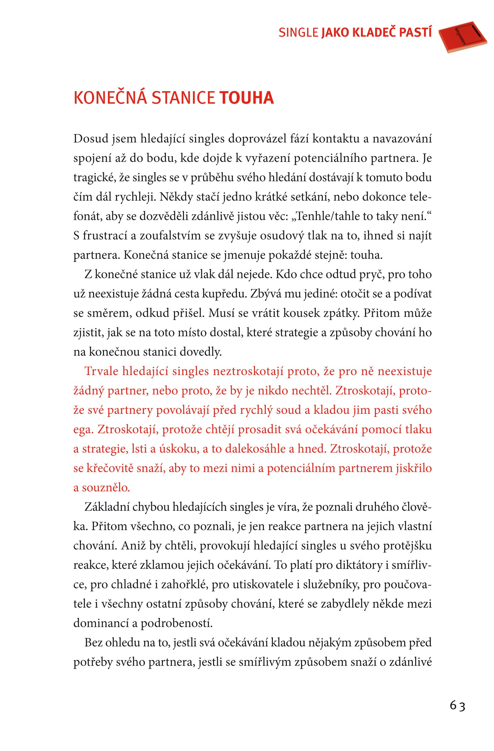 Autor vás nenechá zmítat se v emocích, ale poskytne vám profesionální pohled. Ukáže chyby, které hledající nejčastěji dělají, doporučí praktické kroky, jak můžete změnit svoje chování. V osobních příbězích lidí, kteří byli při seznamování úspěšní, naleznete inspiraci a návody k řešení svého vlastního života.