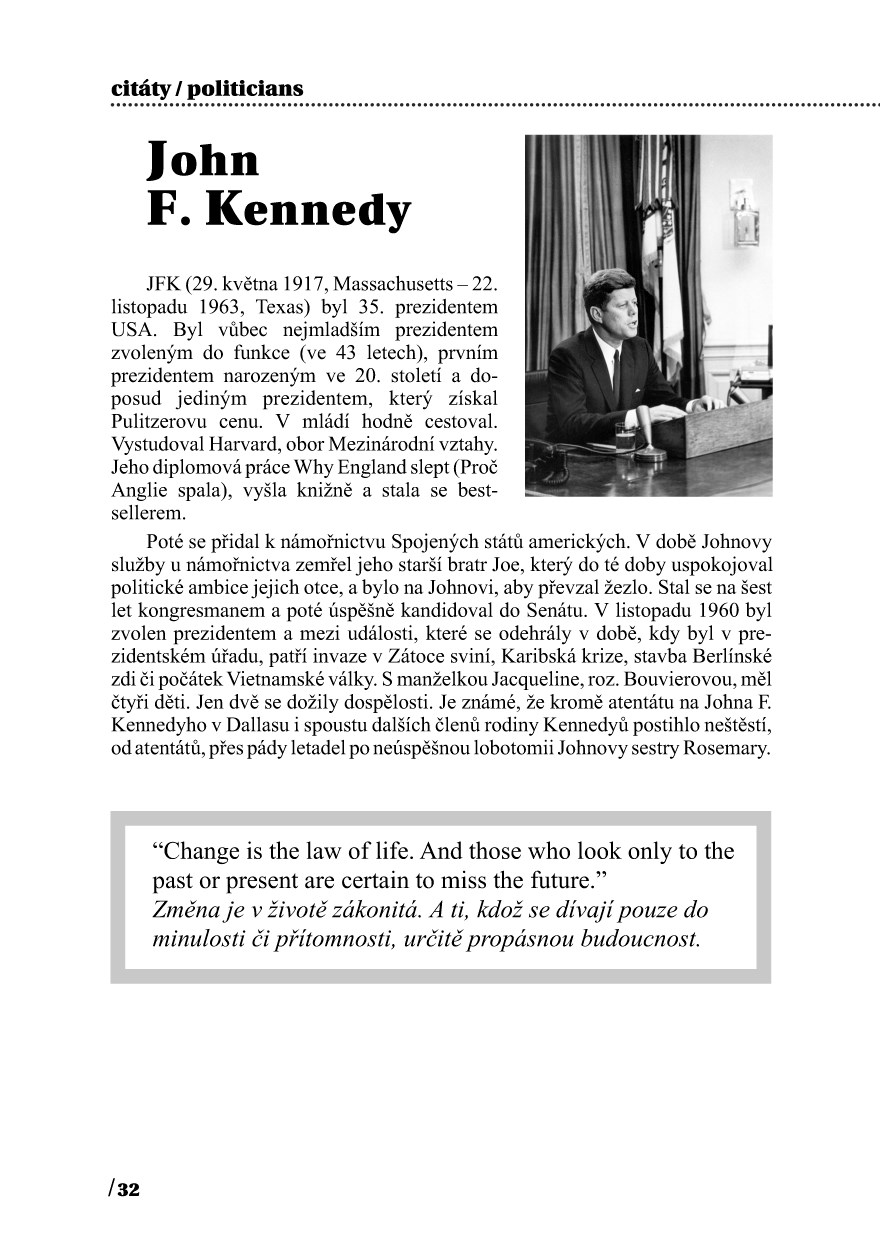 Vybrali jsme pro vás citáty čtyřiceti pěti osobností z historie i ze současnosti a kromě toho, že se budete moct poučit, zasmát, souhlasně pokývat hlavou či jí nevěřícně kroutit nad tím, co všechno mohou lidé veřejně vyřknout či napsat, máte možnost se i něco přiučit z anglického jazyka.