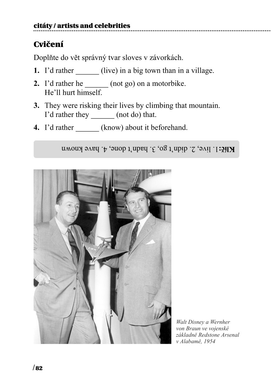 U každé osobnosti najdete český stručný životopis a několik citátů v angličtině s českým překladem. Z jednoho citátu je vždy vybraný a okomentovaný jazykový jev, který si následně procvičíte. Výběr osobností nebyl jednoduchý, protože skutečně bylo z čeho vybírat. Snažili jsme se najít takové osobnosti, jejichž citáty jsou nejčtenější, a protože nám jde především o výuku angličtiny a anglické autentické texty, jsou to všechno angličtí rodilí mluvčí. Až na jednu výjimku a tou je Albert Einstein. Jeho bonmoty prostě v našem výčtu nemohly chybět a vzhledem k tomu, že posledních 22 let svého života žil v USA, můžeme snad i jeho angličtinu