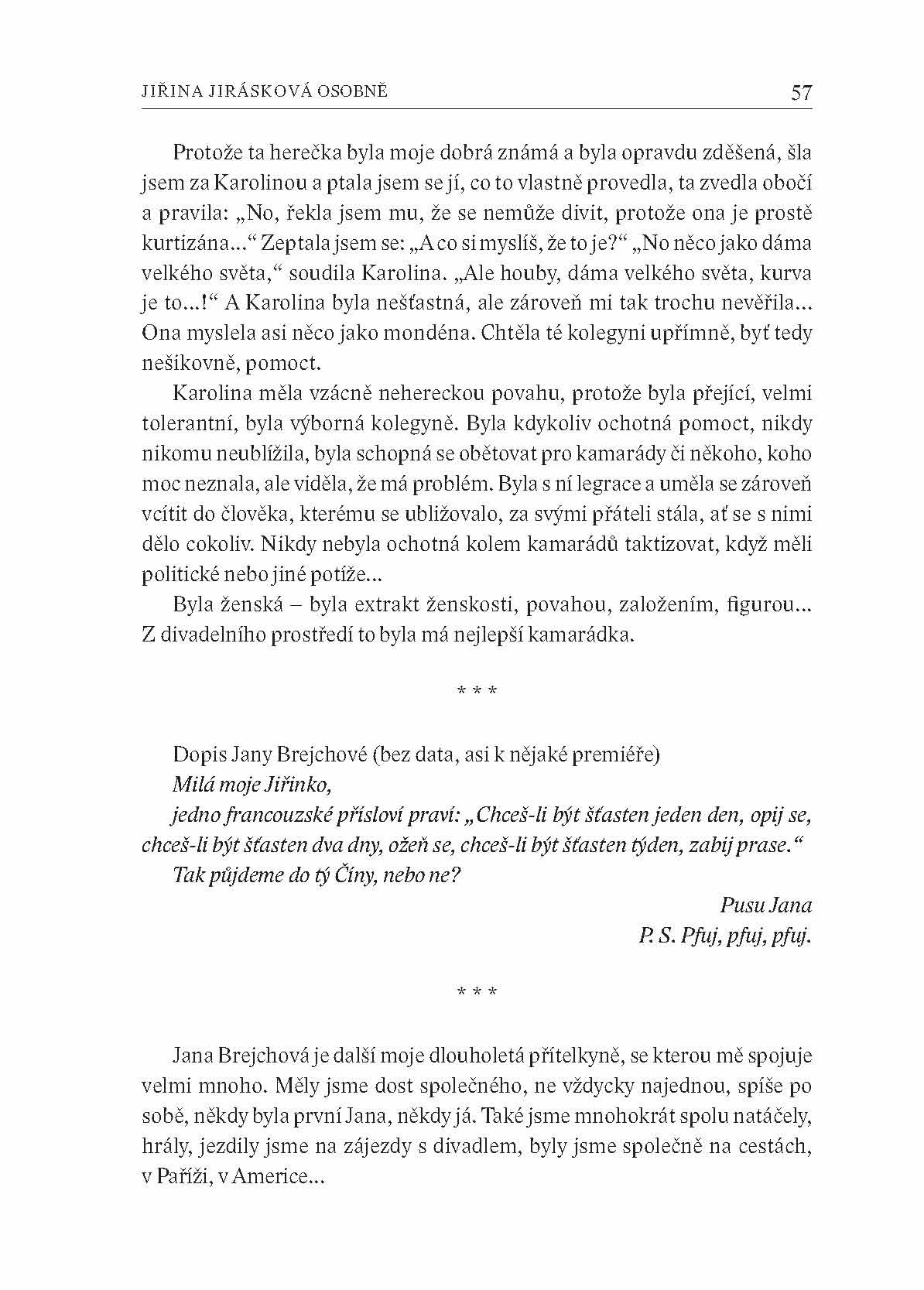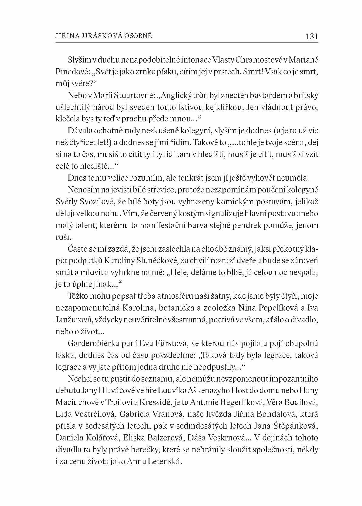 Kniha je nejen pronikavou sondou do všech oblastí života člověka-umělce, ale i úvahou vynikající herečky nad smyslem herectví, divadla, nad jeho vývojem. Jiřina Jirásková hovoří o svých kolezích, velkých hereckých osobnostech, o významných divadelních i filmových rolích, přemýšlí o mezilidských i profesních vztazích a rozjímá nad společenskou angažovaností. Málokterá umělkyně se tak hluboko zapsala do srdcí českých diváků svými nezapomenutelnými rolemi jako Jiřina Jirásková.