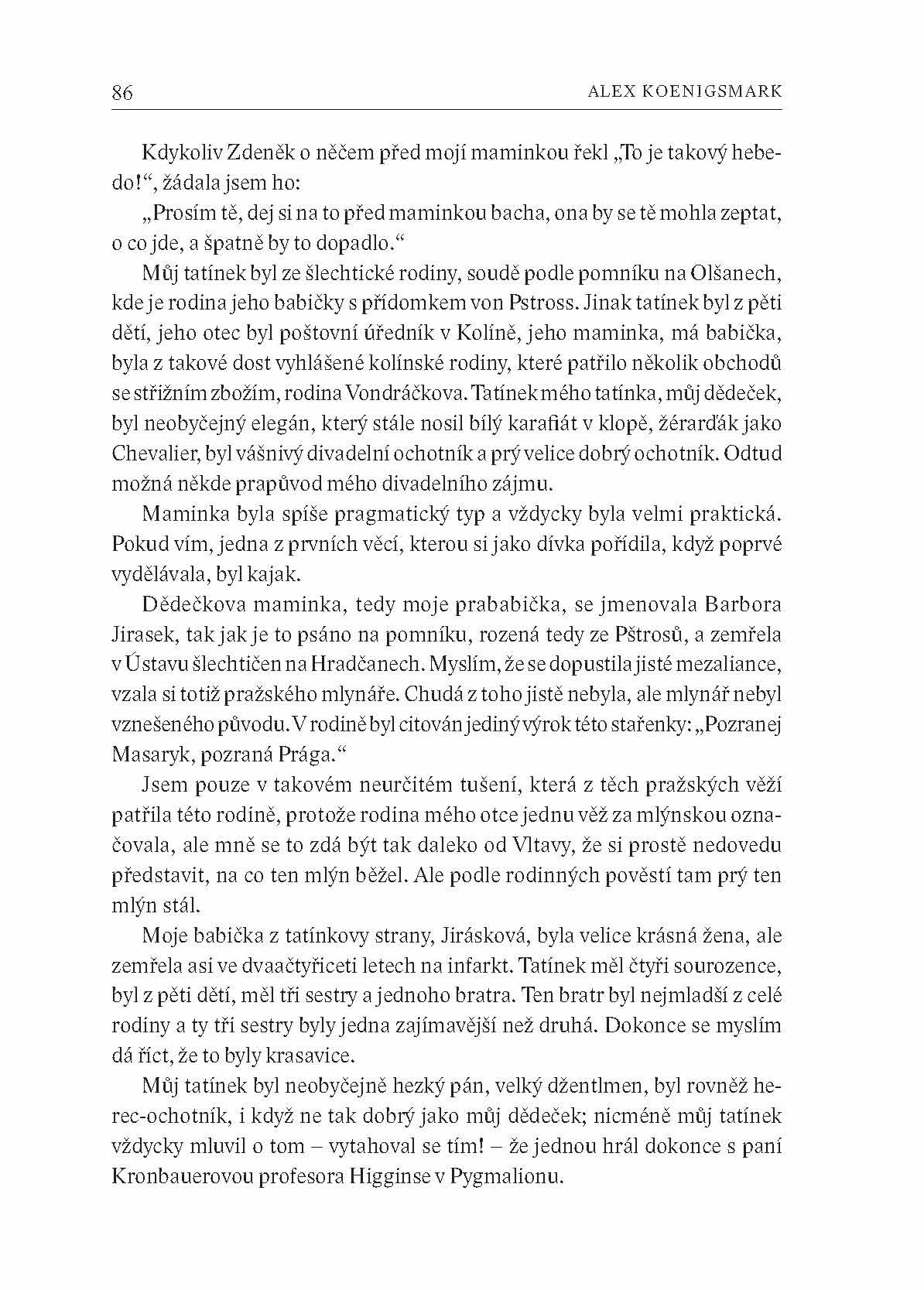 Toto není herecká monografie. Je to pokus o portrét člověka, říká autor v úvodu knihy. Rozhovor s divadelní a filmovou herečkou Jiřinou Jiráskovou není jen tak obyčejným interview, kterých si přečtete stovky v nejrůznějších časopisech. Alex Koenigsmark předkládá hluboké zamyšlení nad dobou, již tato významná umělkyně prožila a prožívá a která tak silně zasáhla celou jednu uměleckou generaci svými politickými i společenskými zvraty. Ponoří-li se čtenář do hereččiny zpovědi o soukromém životě, rodině, mamince, láskách, o milovaném životním partnerovi, musí obdivovat její otevřenost, smysl pro detail, moudrost, vtip a intelekt.