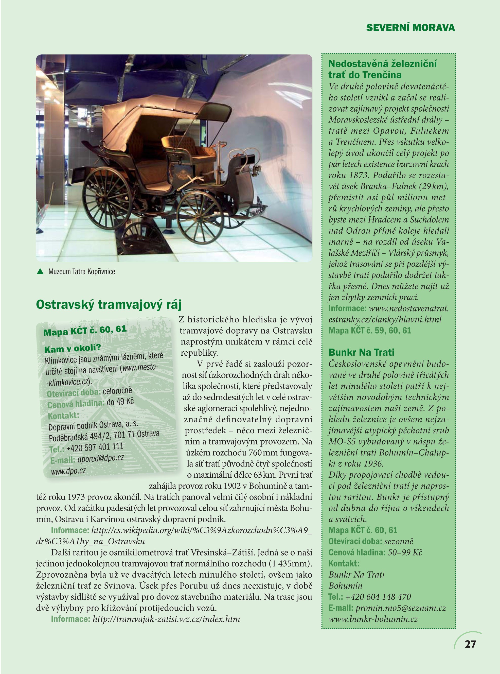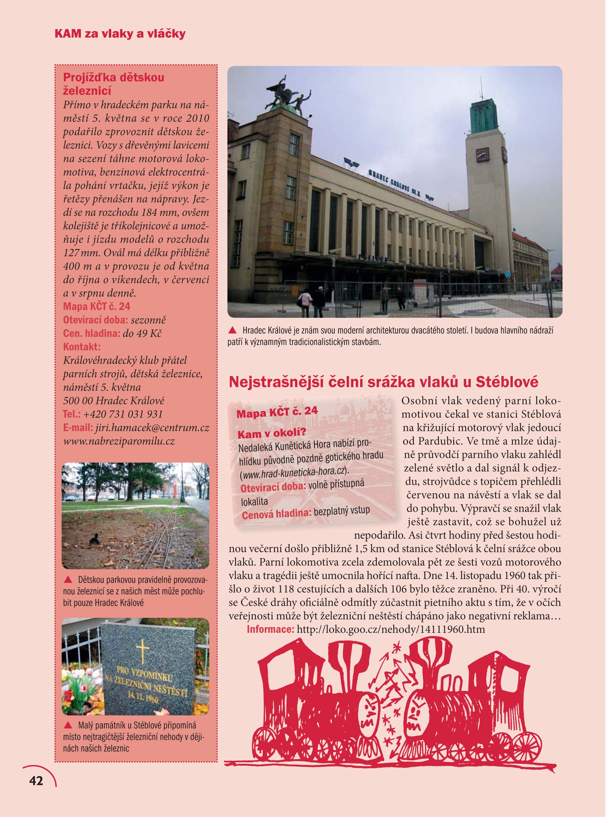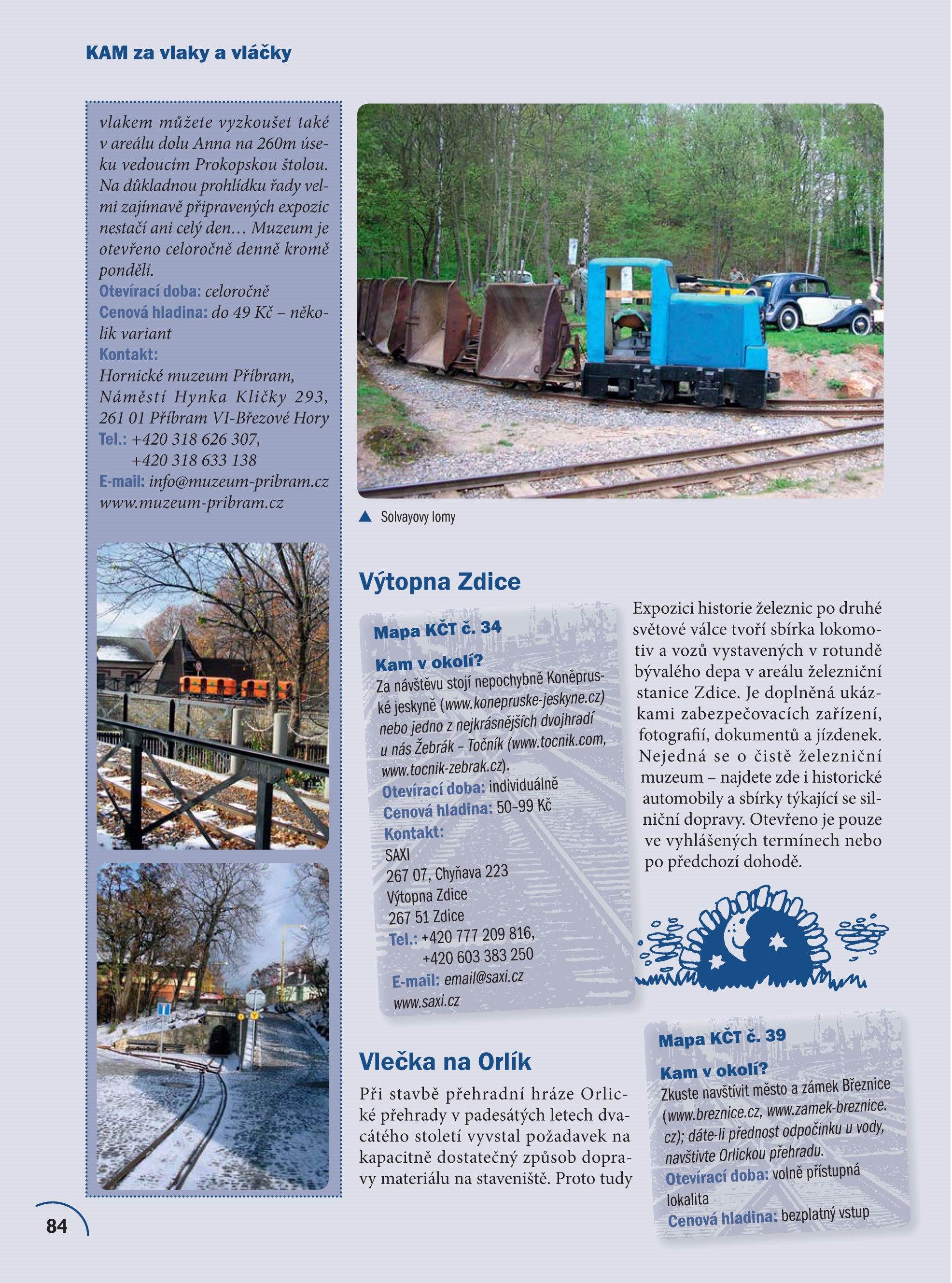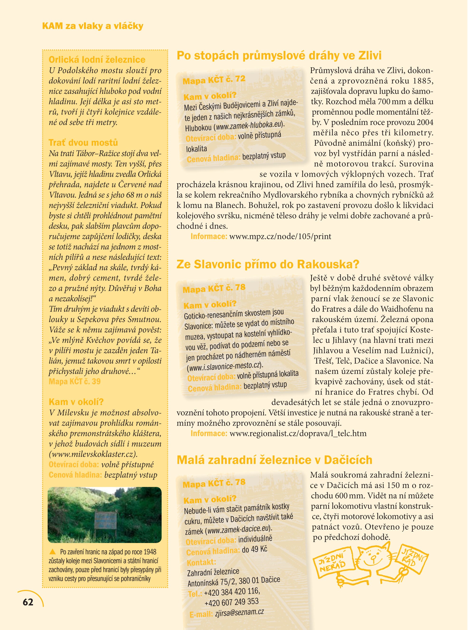 Také vás už někdy přitáhlo kouzlo parních vlaků, opuštěných nádražíček v lesích nebo expresů svištících po stříbrných nitkách do neznáma? Zbrusu nové, aktualizované vydání navazující na úspěšný titul KAM v ČR: Za vlaky a vláčky vám opět přináší atraktivní menu výletů, na kterých budete poznávat historické tratě a železniční rarity, romantické lokálky, železniční muzea či zahradní železnice. Na své si přijdou nejen příznivci kolejové dopravy, ale i jejich doprovod či rodinní příslušníci – v knize naleznete spoustu tipů na návštěvu míst, které s vlaky či vláčky nijak nesouvisí. Publikaci doplňuji stovky ilustrací a fotografií, přehledná mapa, kontakty a informace o otevíracích dobách a výši vstupného, které vám pomohou naplánovat výlet přesně na míru.