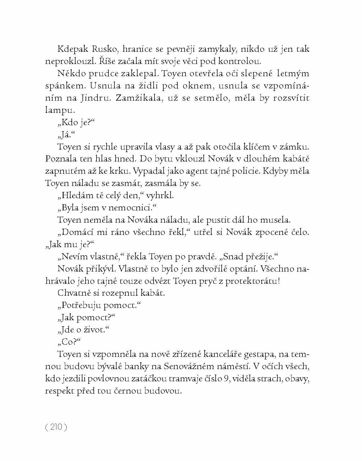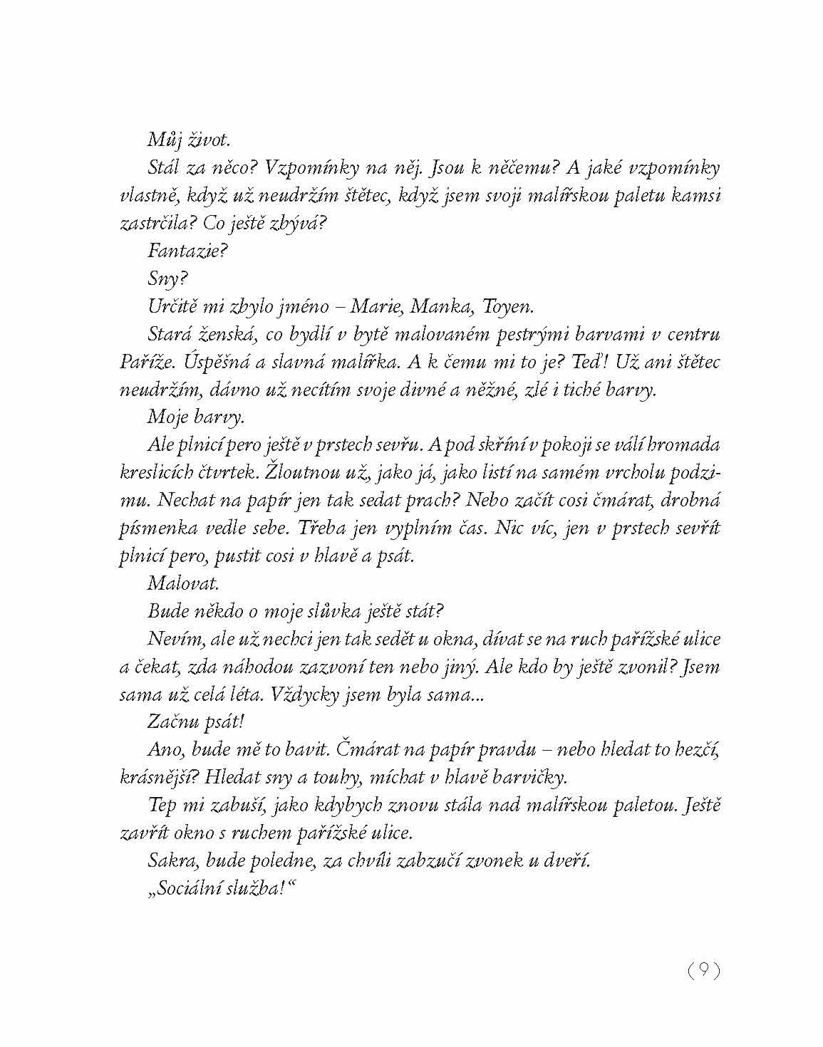 Beletrie spisovatele Vladislava Kučíka je uměleckou fikcí života slavné výtvarnice Toyen. Příběh sám je skládán jako střípky mozaiky, je vlastně vyprávěním staré paní Toyen, která ve svém pařížském bytě rekapituluje kus svého života. Ale bylo tomu opravdu tak?