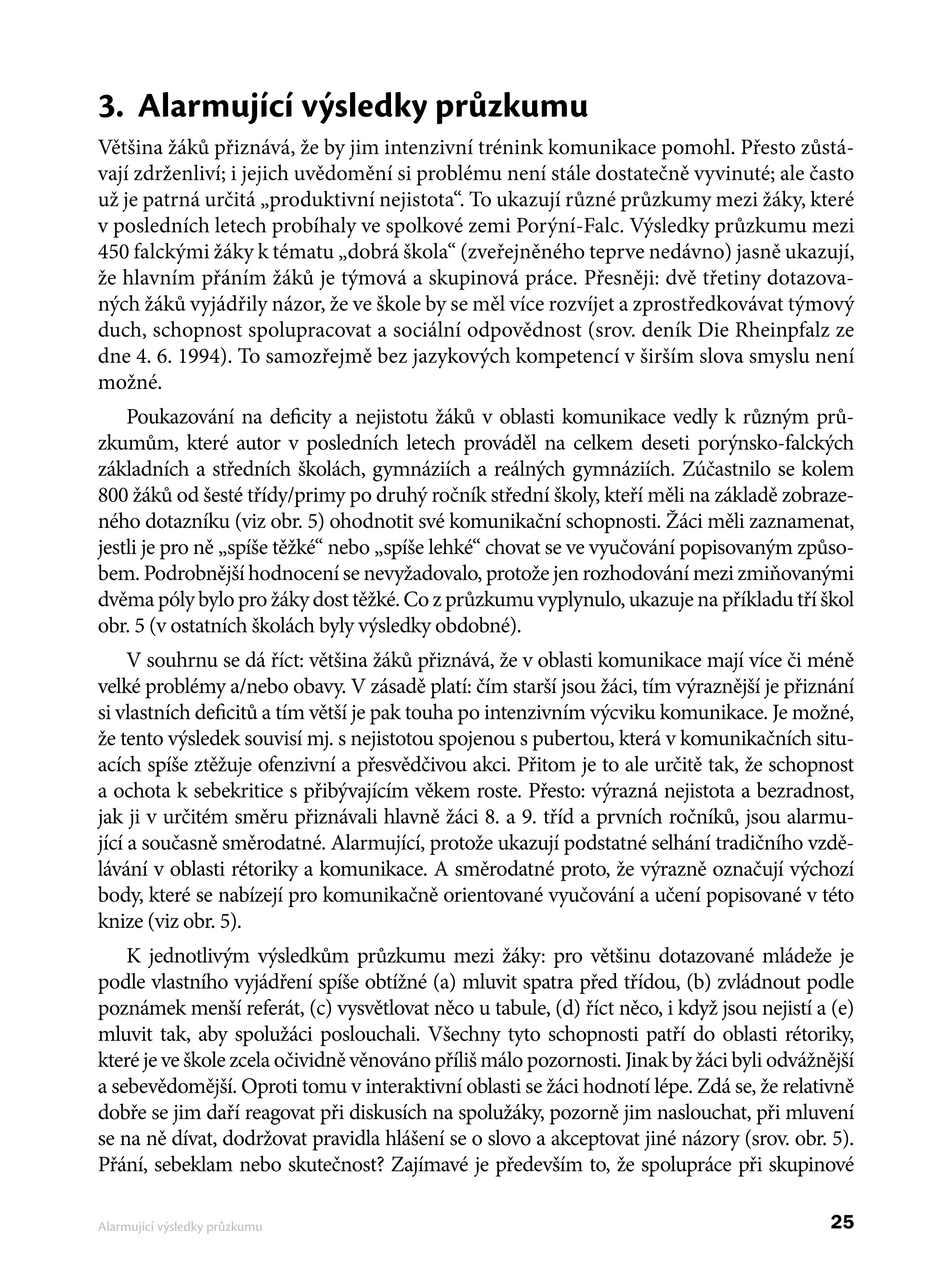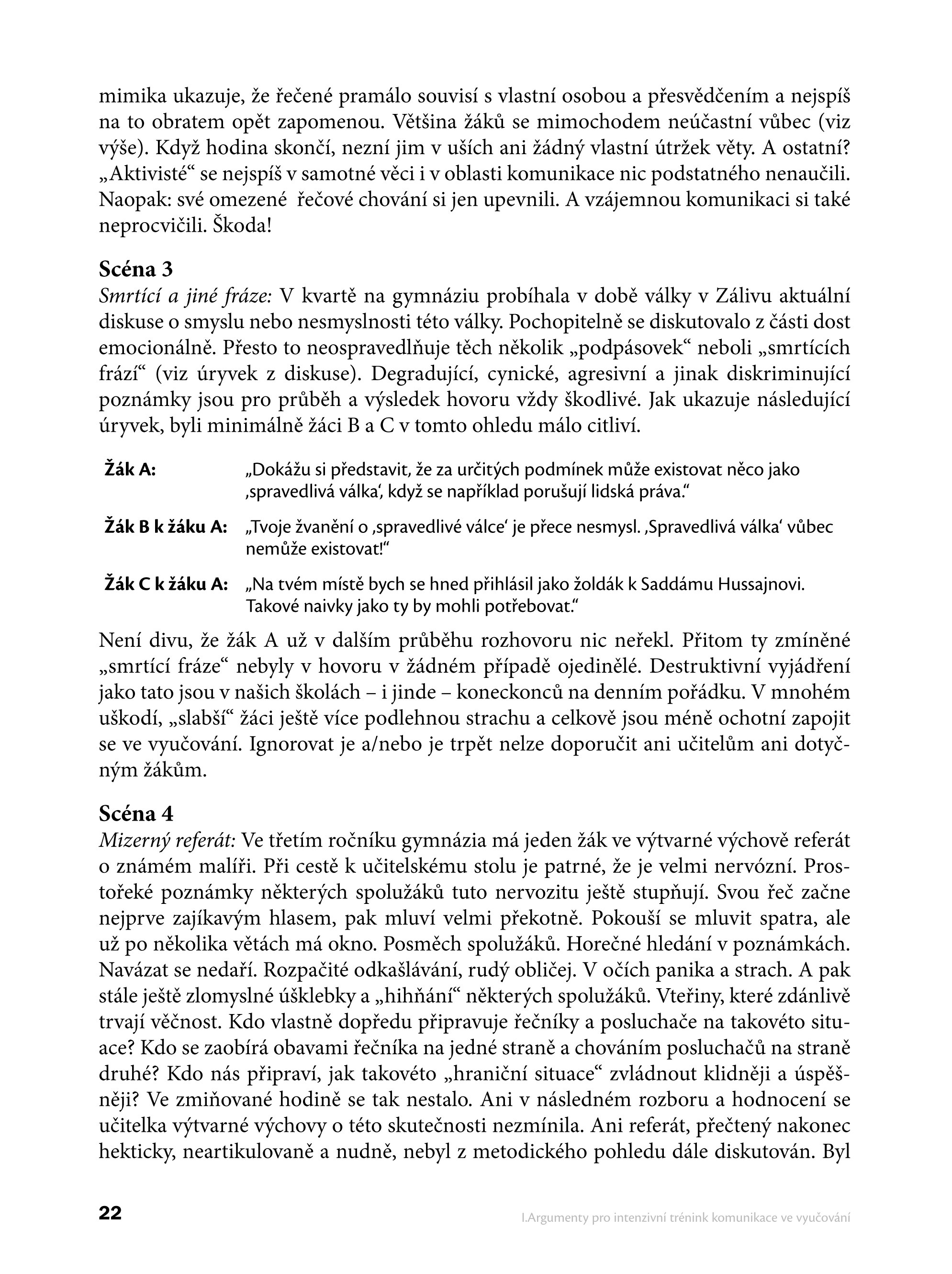 Tato kniha je velmi zdařilým počinem. Její hodnotu spatřuji nejen ve spoustě praktických cvičení na rozvoj komunikačních dovedností, ale také v myšlence zavádět komunikační výuku do škol. Předkládá množství pádných argumentů, proč je tato výuka důležitá a nezbytná pro celistvý rozvoj žáků a studentů. Ukazuje, jak rozvoj komunikačních dovedností přispívá k jejich větší motivaci a odpovědnosti i k samostatnému myšlení. Zároveň je vysvětleno, jaký profit přinese komunikační výuka celé společnosti.