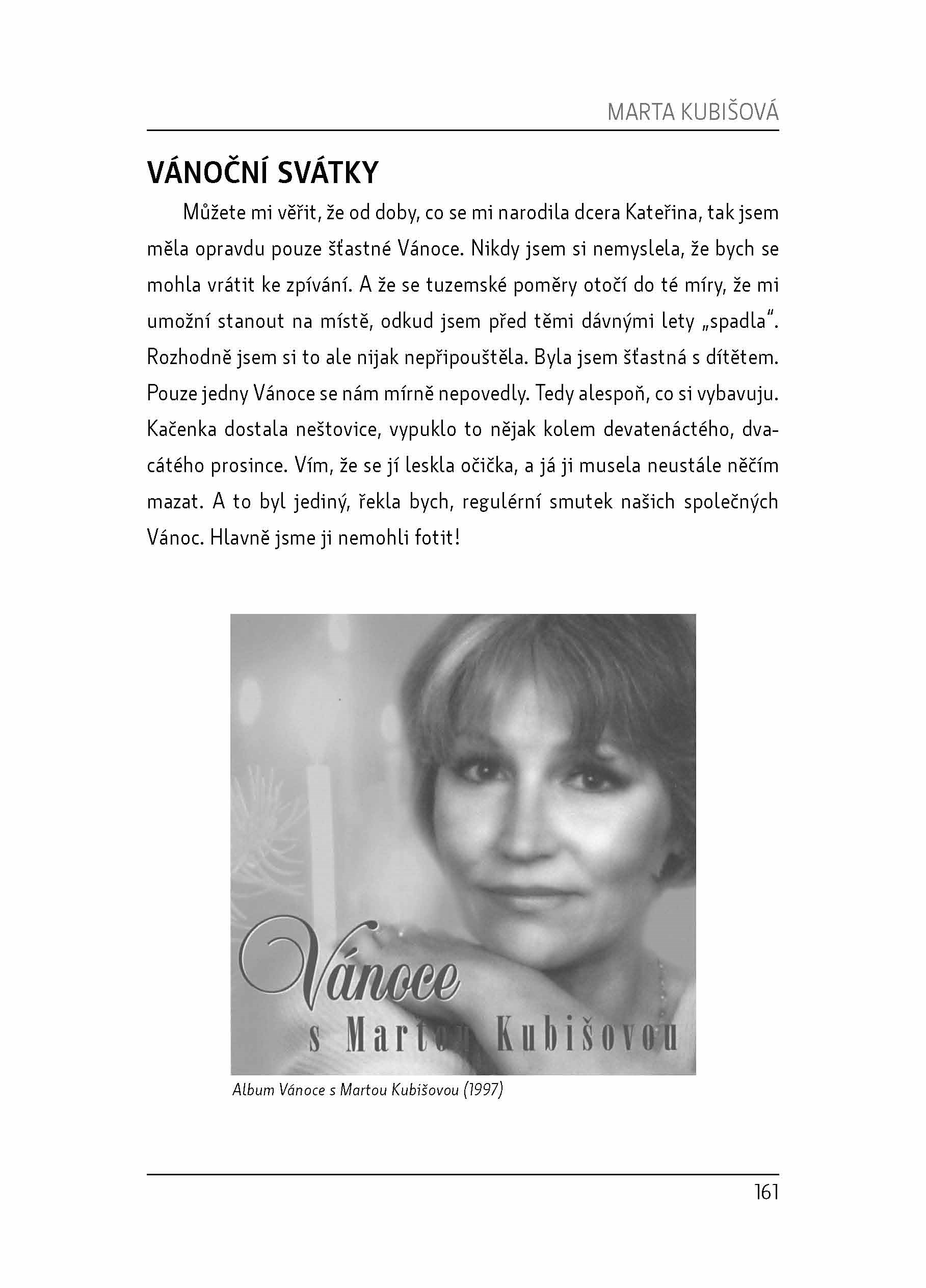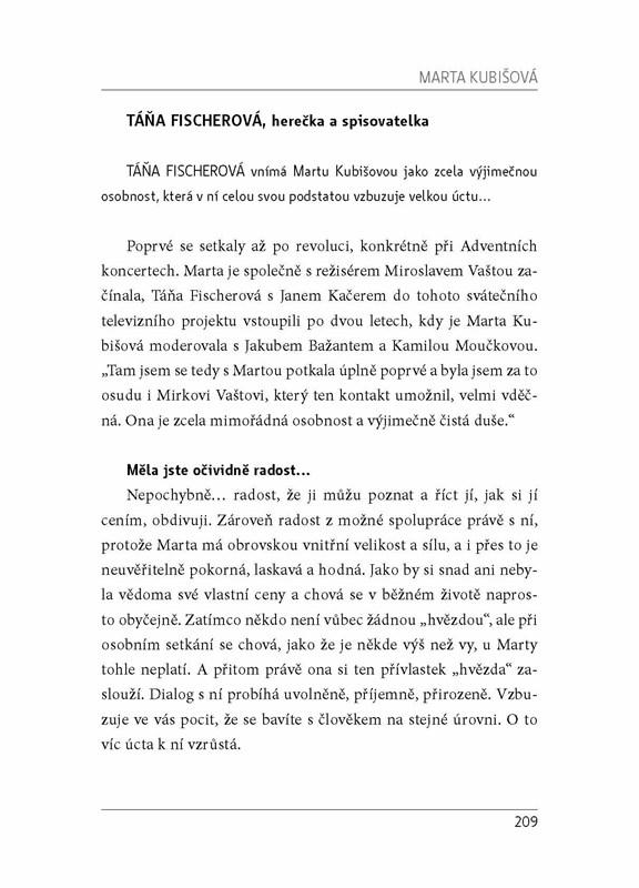 Držitelka tří Zlatých slavíků, členka legendárního tria Golden Kids, interpretka známých songů Loudá se půlměsíc, Modlitba pro Martu ad., ale i signatářka a po uvěznění Václava Havla také mluvčí Charty 77... Jakými životními a profesními rolemi si Marta Kubišová prošla a jakými žije dnes, přinese biografická publikace jedné z nejvýraznějších osobností pop music uplynulého půlstoletí.