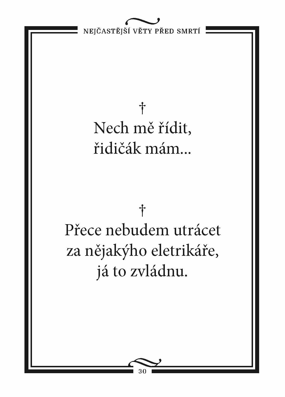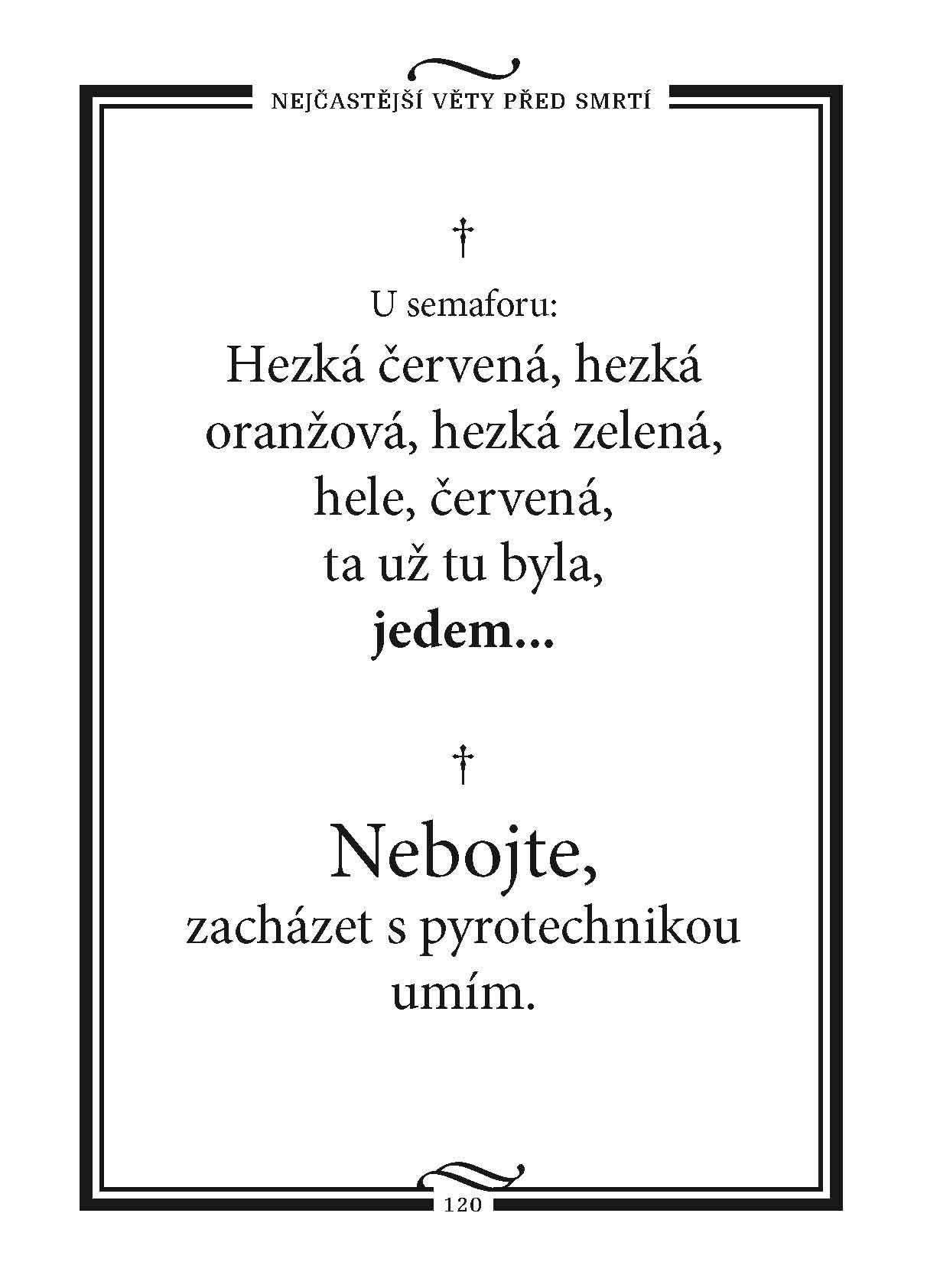 Všichni jednou umřeme… A všichni proneseme svá poslední slova… Jen doufejme, že to nebude například „Vsaď se, že vydržím deset minut pod vodou“ nebo „Tady už vlak nejezdí celý léta“. Knížku plnou toho nejčernějšího humoru doplňují ilustrace humoristy Lubomíra Lichého.
