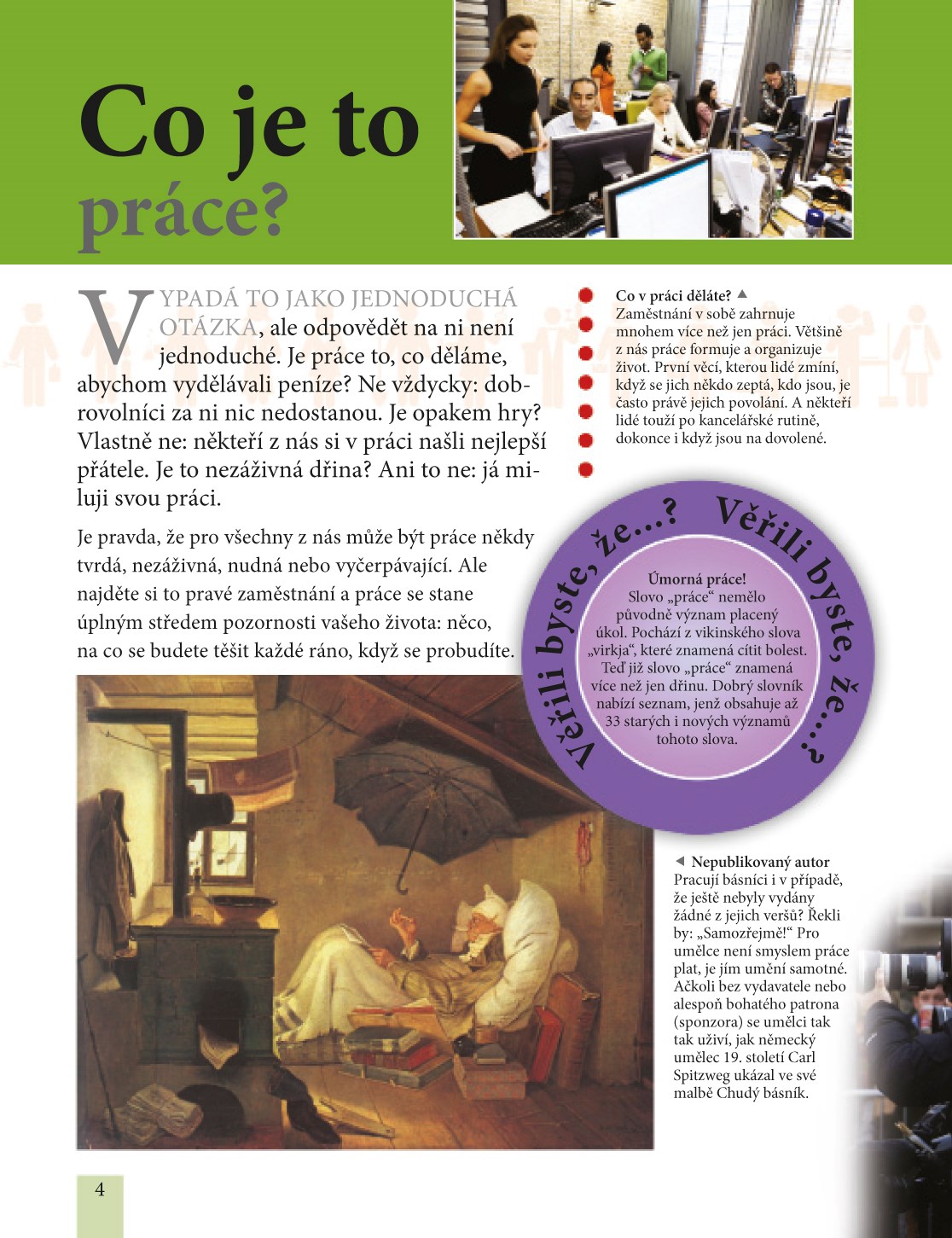 museli lovit a sbírat semena, ovoce a kořínky. Když to srovnáme s prací v továrně nebo kanceláři, zdá se nám to snadné, a snadné to i bylo. Lovci-sběrači pracovali méně než polovinu času dnešní běžné rutiny od pěti do devíti. Práce se brzy změnila v něco, co muži a ženy dělali pro pána, aby ji mohli vyměnit za půdu, jídlo, zboží a později i peníze. Od doby, kdy v 19. století první dva rybáři dostali placené zaměstnání na lodích a trzích, začala „práce“ znamenat zhruba to stejné, co znamená dnes. Takže proč by nás práce měla zajímat? Protože ji musíme dělat celých čtyřicet let! Není to tak zlé, jak to zní. Spousta lidí si najde práci, kterou miluje. Tato kniha vám může pomoci udělat to samé. Prozkoumává svět práce