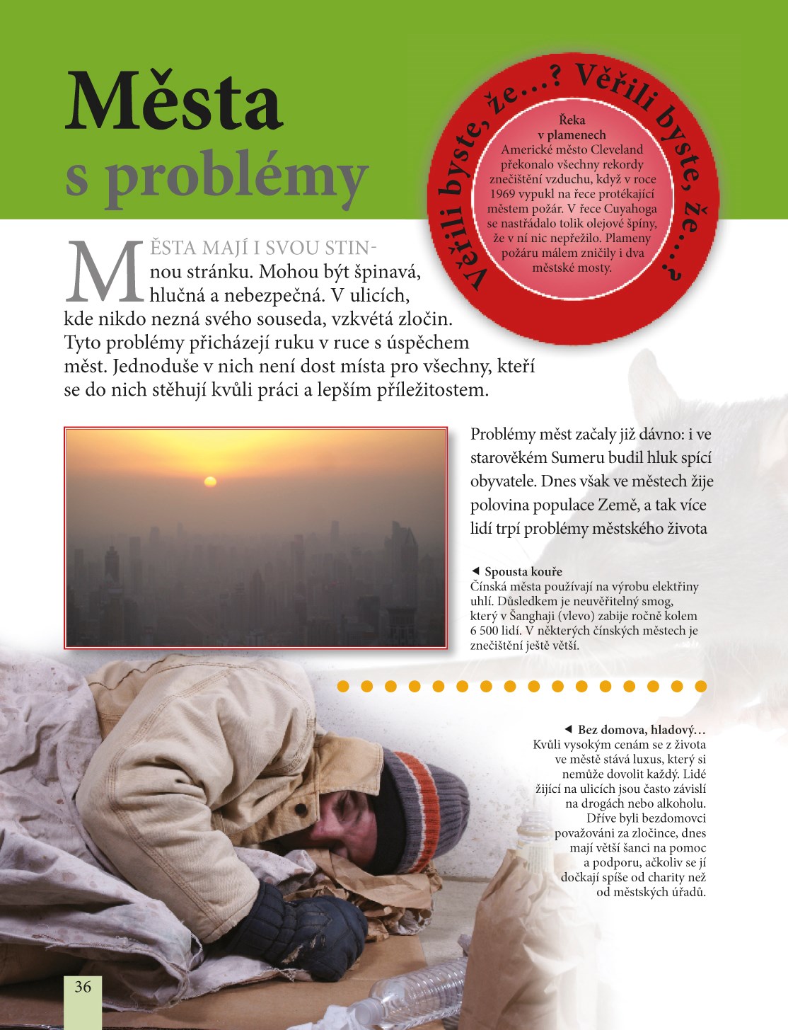 Města jsou krásným místem pro život, práci i zábavu. Mají však i své stinné stránky: mohou být přelidněná, hlučná, znečištěná a nebezpečná. Mnoho měst a velkoměst se vejde do obou