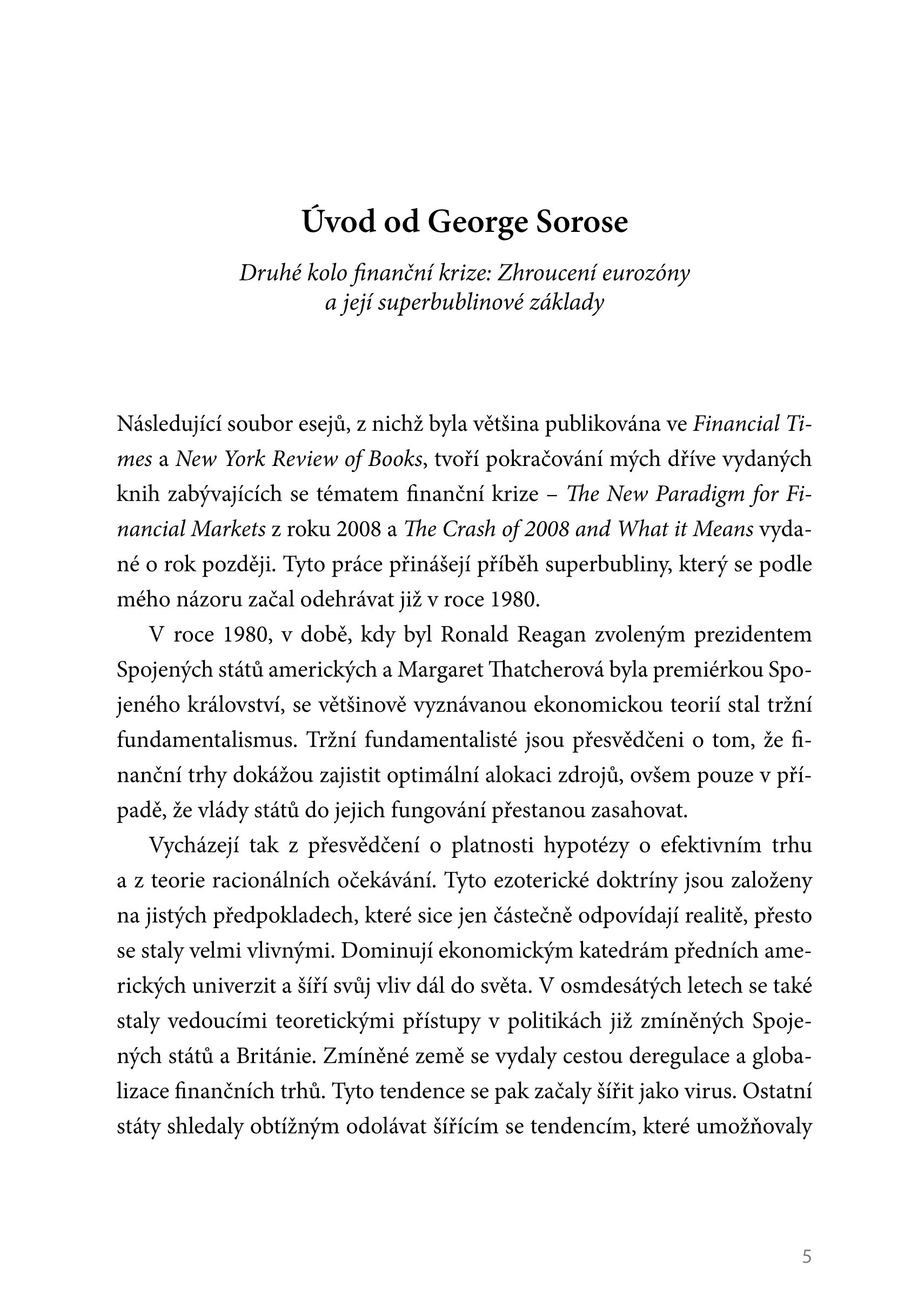 Obtížná hospodářská situace, ve které se nyní nacházíme, není pouze výsledkem hospodářských sil, nýbrž také politiky, kterou zastávají (nebo nezastávají) světoví lídři. V této sbírce esejů na téma globální finanční situace představuje George Soros svůj pohled a analýzu klíčových politických rozhodnutí vedoucích k finanční krizi a podporujících ji.
