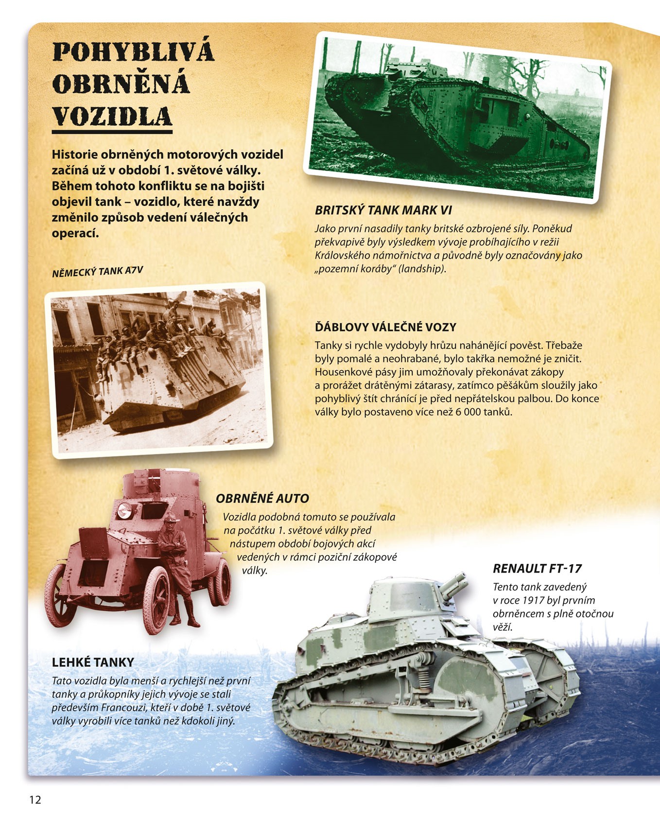 * Historický úvod s fotografiemi raných vojenských bojových vozidel, letounů i válečných lodí a ponorek