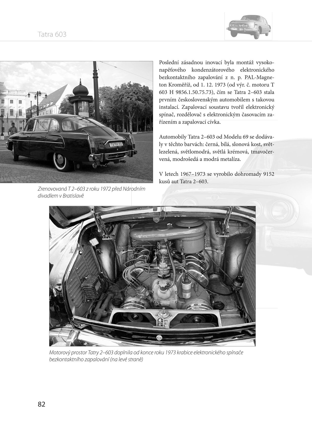Kniha popisuje historii českého kultovního automobilu Tatra 603 - jednoho z nejzajímavějších vozidel své doby. Naleznete zde cenné dobové fotografie a nákresy, prototypy, ukázky reklamních plakátů, technické informace, vývojové změny, podklady pro servis a provoz těchto stále více ceněných vozů i další modifikace vozidel. V závěru knihy jsou uvedeny podrobné technické údaje ke všem modelům vozidel Tatra T 603 a T2-603.