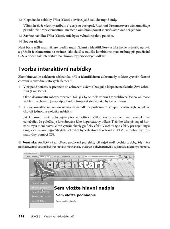 Naučte se tvořit statické a dynamické webové stránky, vkládat do nich grafiku, text, animace a video. Vyvíjejte interaktivní aplikace, experimentujte s novými možnostmi HTML5 a CSS3, nahrávejte a spravujte kompletní weby a mnohem více. Jednotlivé lekce vás seznámí se základními i pokročilými nástroji a na připravených pracovních souborech si rovnou vyzkoušíte jejich praktické využití.