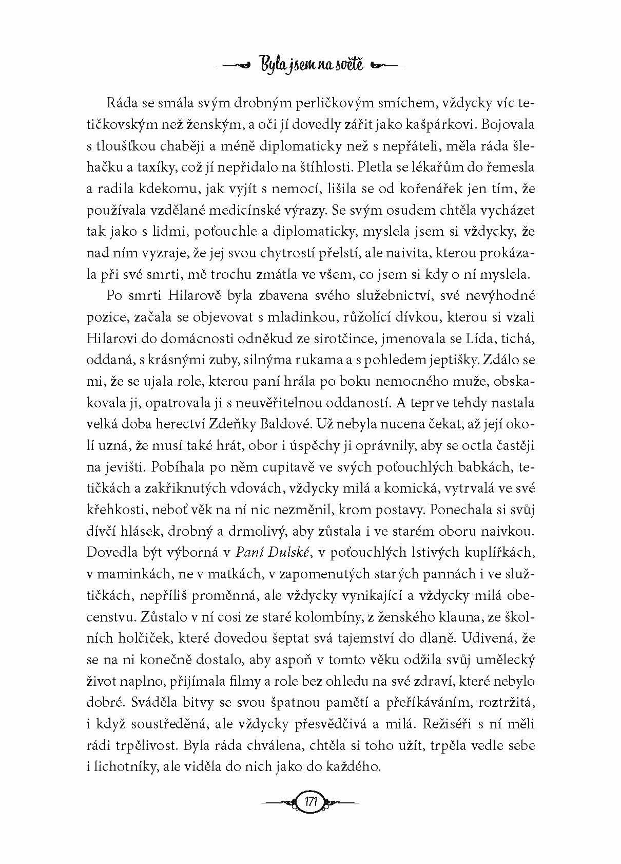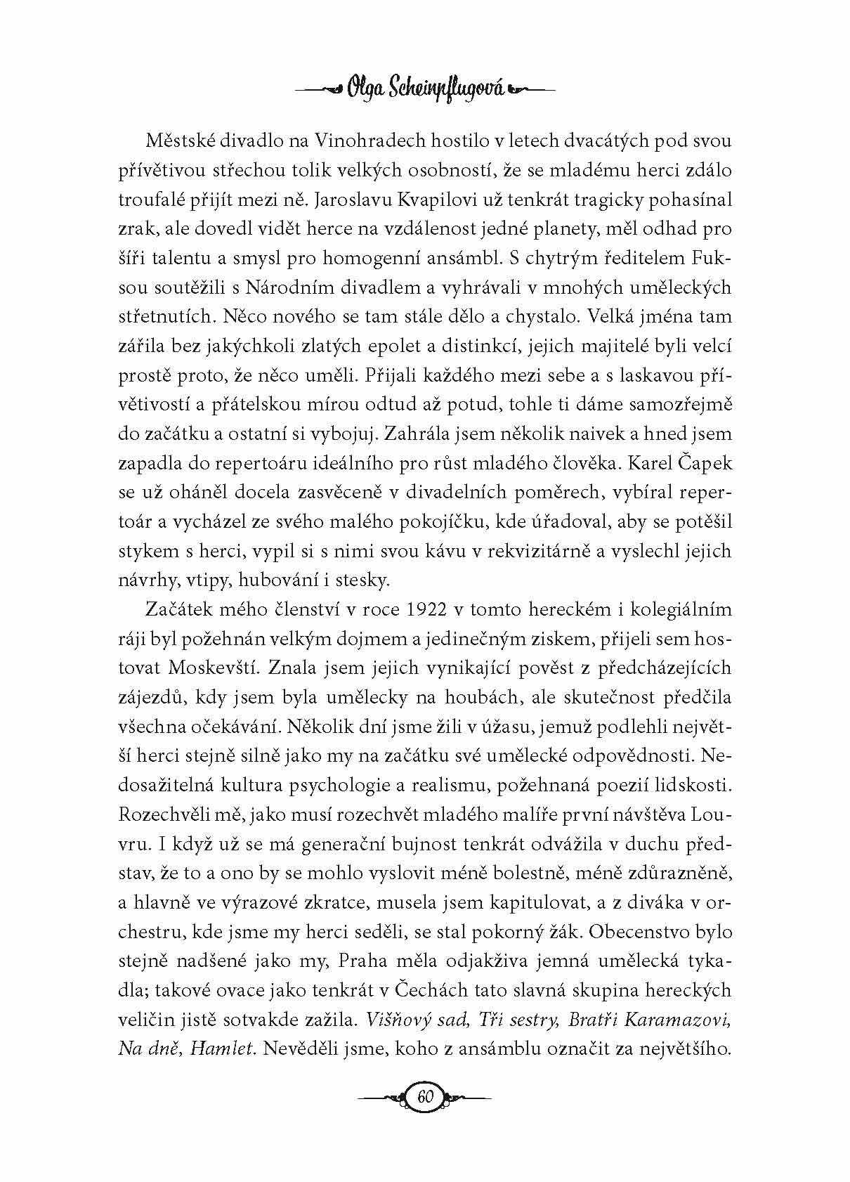 Olga Scheinpflugová (1902–1968) ve svých osobitě komponovaných pamětech vzpomíná na herecké a režisérské osobnosti českého divadla. S většinou z nich ji nepojily jen profesní vazby, ale také pouta přátelská. Do těchto vzpomínek jsou pak vetknuty i úvahy o smyslu a poslání herecké práce, rozjímání o vztahu s Karlem Čapkem, zážitky z druhé světové války i z let následujících.
