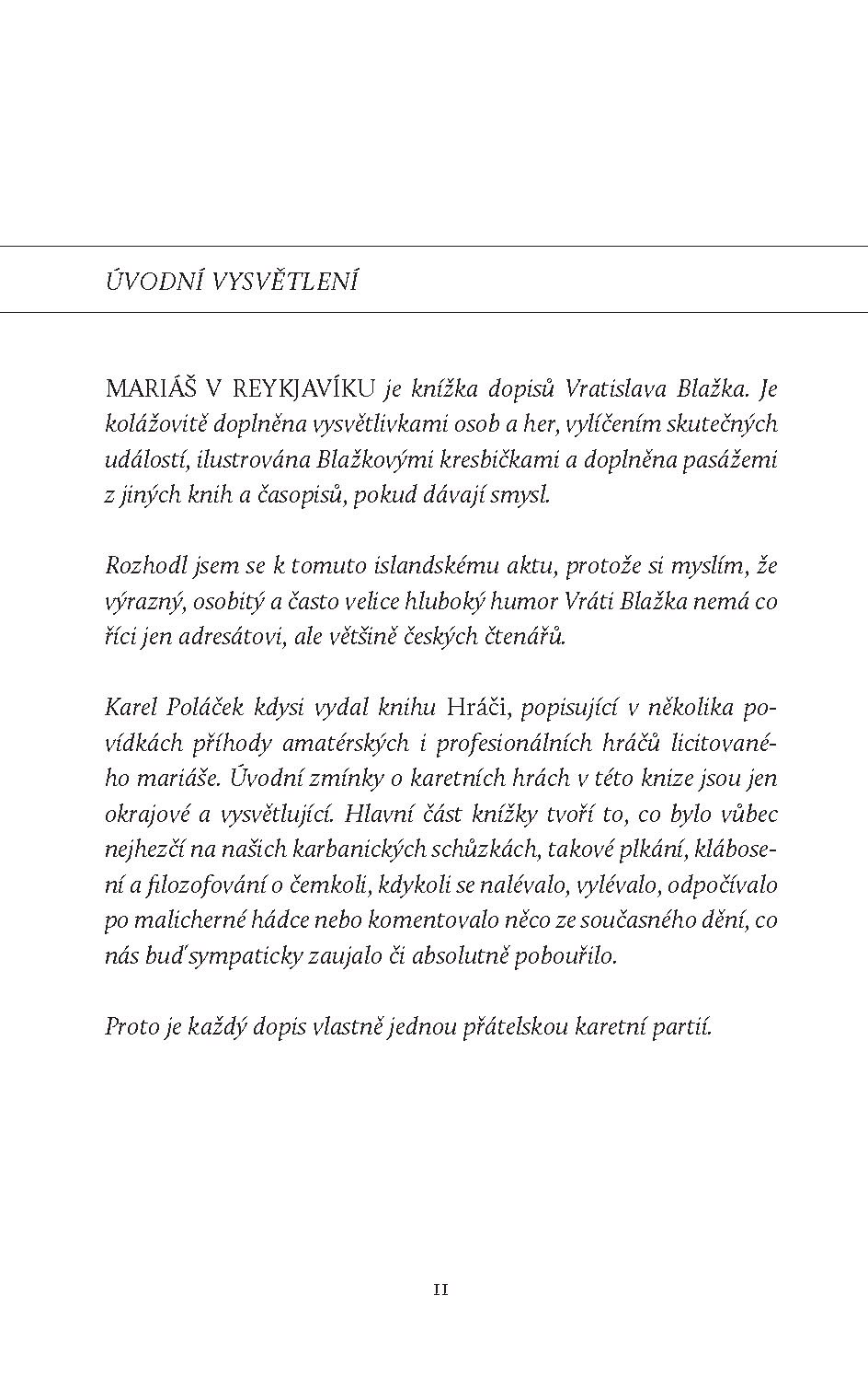 Vratislav Blažek (1925–1973) je známý především jako scenárista a dramatik. Mezi jeho nejznámější díla patří předlohy ke kultovním českým filmům Starci na chmelu či Dáma na kolejích; otextoval i řadu písní, které časem zlidověly, mimo jiné je autorem textu první české písně s „videoklipem“ Dáme si do bytu. Sám se stal předobrazem pro postavu Blažeje ze Škvoreckého románu Příběh inženýra lidských duší. Mariáš v Reykjavíku (1975) vydal v roce 1975 Josef Škvorecký v exilovém nakladatelství 68 Publishers. Z Blažkových dopisů z let 1968–1973 ji sestavil a předmluvou opatřil Václav Táborský, další významná postava české kinematografie. Současnému čtenáři se v ní nabízí svébytný pohled na jedno vzácné přátelství i do prostředí české emigrace. V roce 1975 za ni Blažek posmrtně získal Cenu Egona Hostovského. V České republice kniha vychází poprvé, a drží se původní úpravy, kterou jí dal grafik Mikuláš Kravjanský.