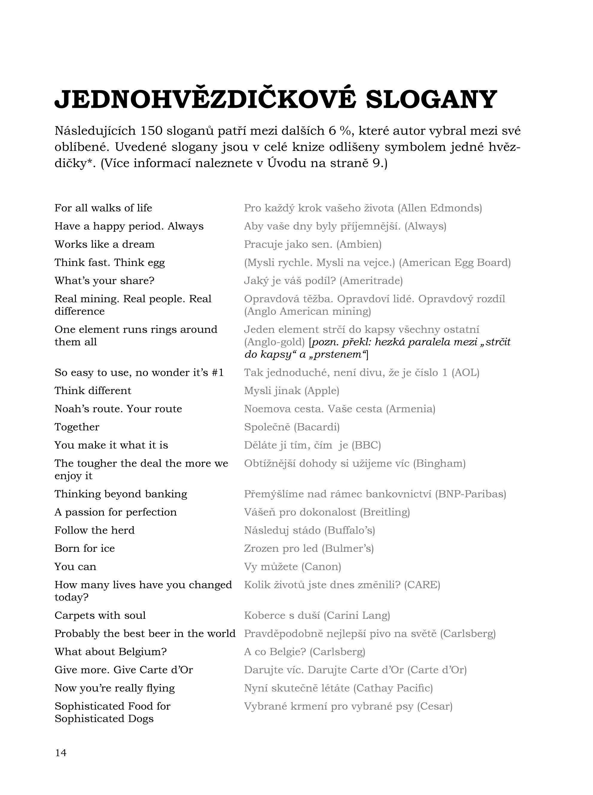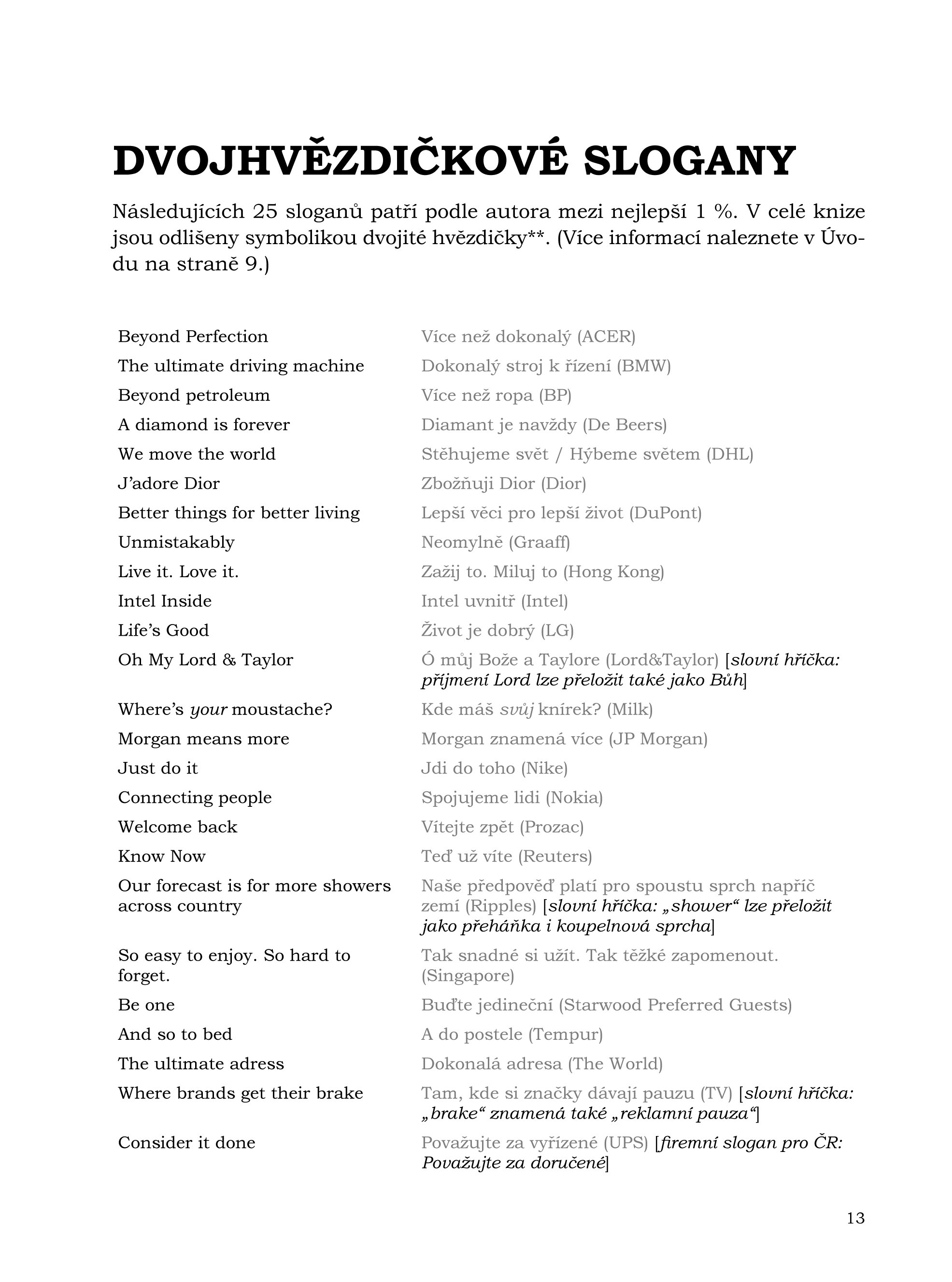 V knize Reklamní slogany naleznete přibližně 2500 pozoruhodných sloganů – většinou dobré příklady reklamního řemesla, ale také některé zajímavé nezdary.