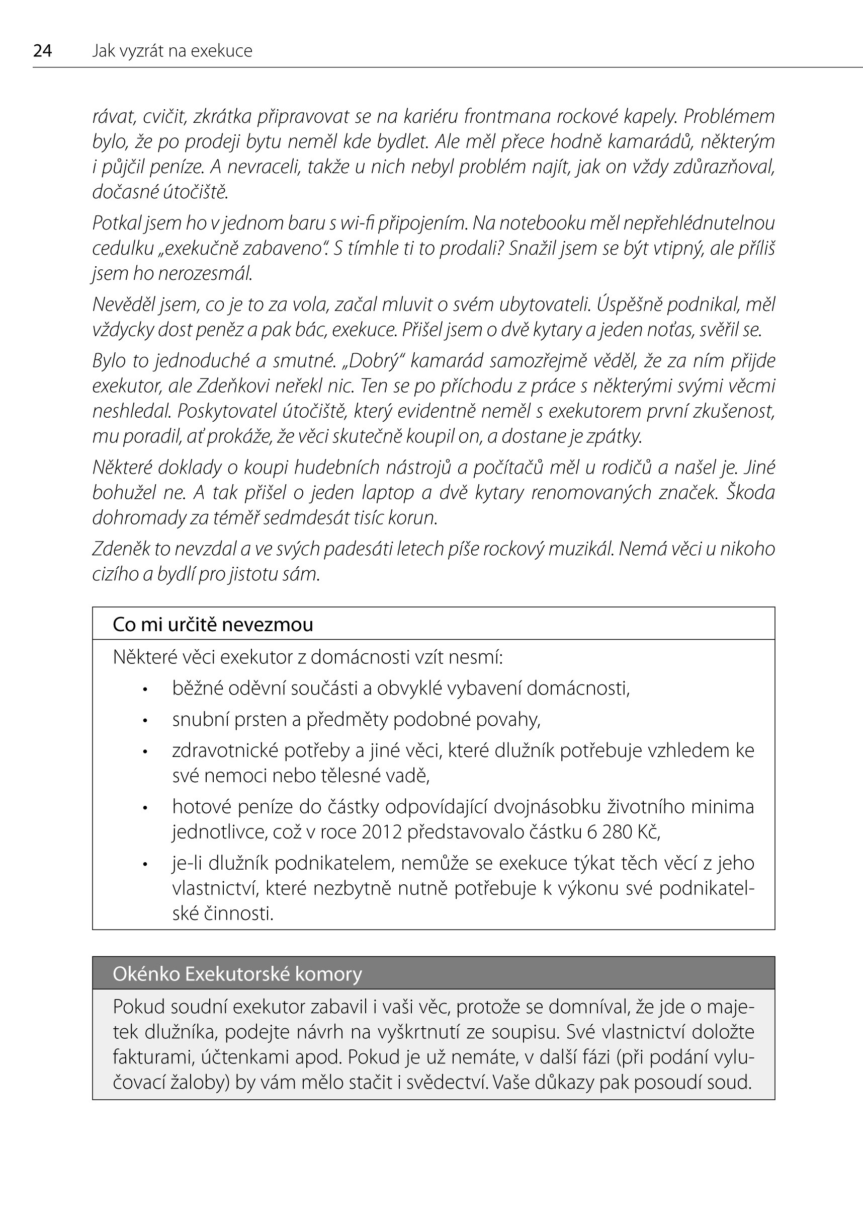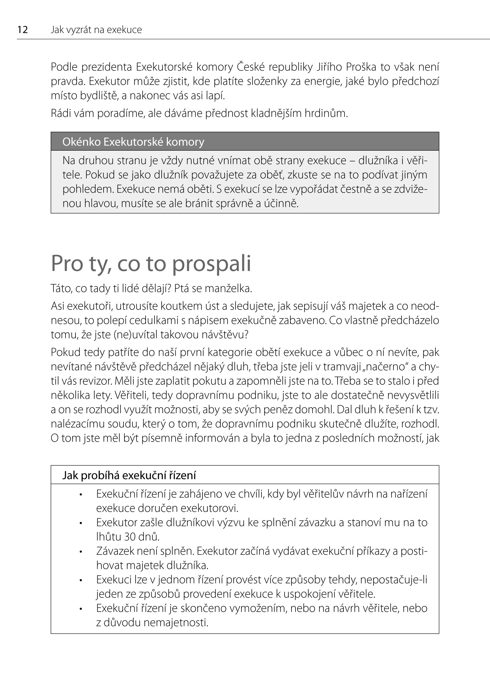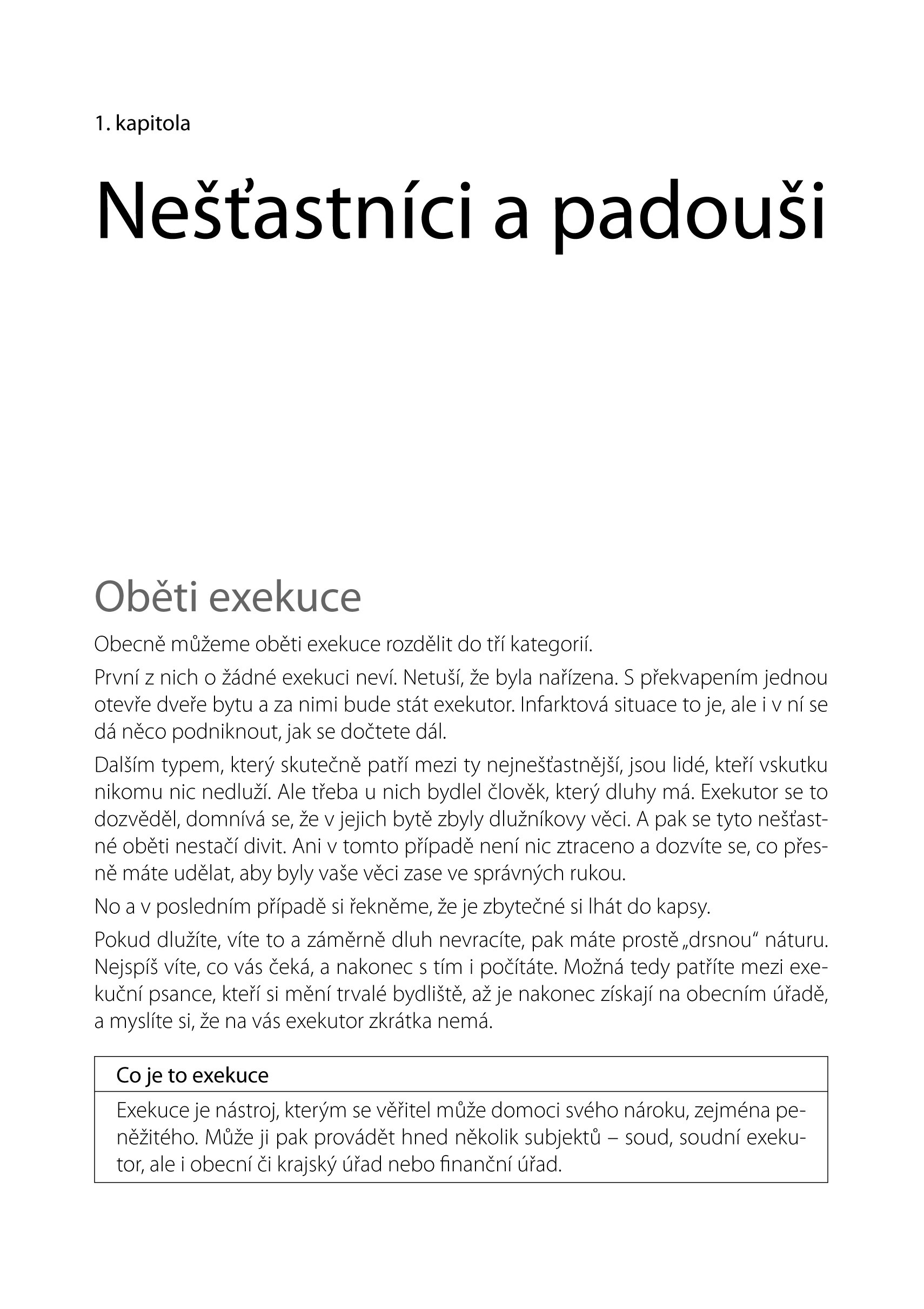 Říká se, že člověk by měl v životě zkusit všechno. Pravda však je, že o něco vůbec nestojíme a spíše právě naopak bychom se některým věcem či dějům nejraději vyhnuli. Mezi ně jistě patří i exekuce, tedy zabavení dlužníkova majetku. V této publikaci se dozvíte, jak se nejlépe zachovat, když je exekuce nevyhnutelná. A také co dělat, když se vám kvůli exekuci udělá v peněžence „průvan“. Samozřejmě také poradíme, jak se pokud možno exekuci vyhnout.