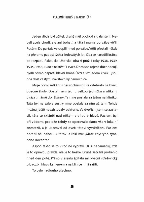 Spolu s novinářem Martinem Čápem dává MUDr. Beneš možnost i laickým čtenářům zamyslet se nad fenoménem jménem „lidský mozek“. Sídlí lidská duše v mozku, jak vůbec náš mozek funguje a jaké jsou současné možnosti neurochirurgie…? Nejen o tom se dočtete v poutavé publikaci s výstižným názvem Cesta do středu mozku.
