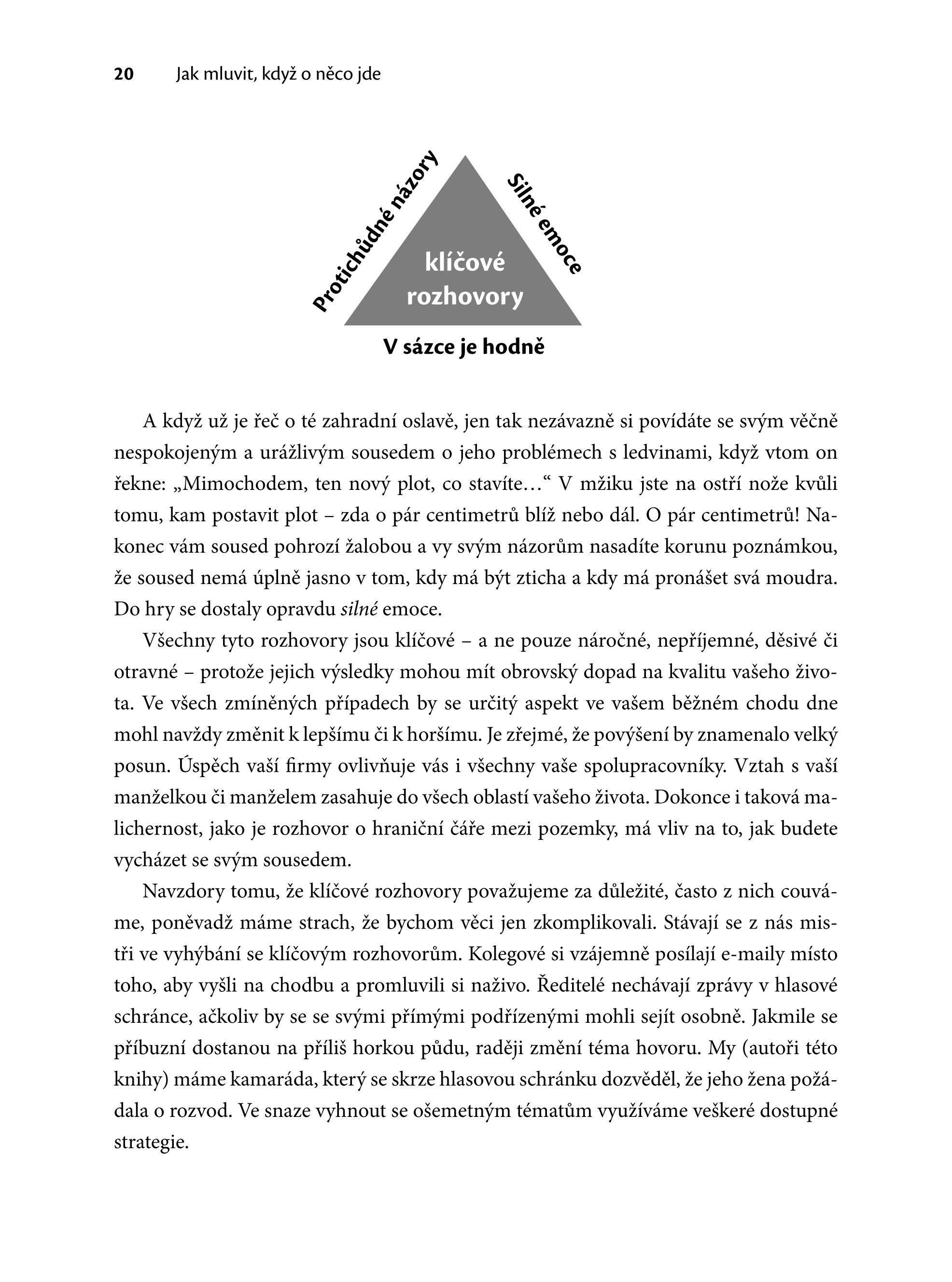 První vydání knihy Crucial Conversations způsobilo revoluci u milionu lidí, když změnili svůj způsob komunikace v situacích, kdy jde o hodně. Nové vydání této knihy přináší několik užitečných nástrojů, které: