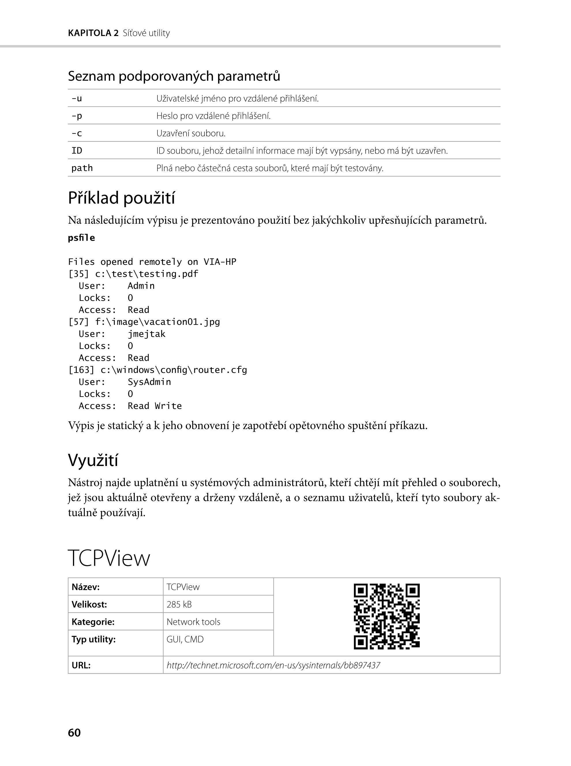 Právě pro vás je zde průvodce a referenční příručka zároveň, v níž najdete všechny důležité souborové, diskové, síťové, procesní, bezpečnostní a systémové nástroje Windows Sysinternals. Představení jednotlivých utilit vždy začíná stručným úvodním štítkem obsahujícím kategorii utility, velikost, odkaz URL, případně QR kód vedoucí na stránku nástroje na portálu Sysinternals.com. Dále se pak ponoříte do seznamu všech podporovaných parametrů. Dozvíte se také, v jakých konkrétních situacích lze utilitu v praxi využít.