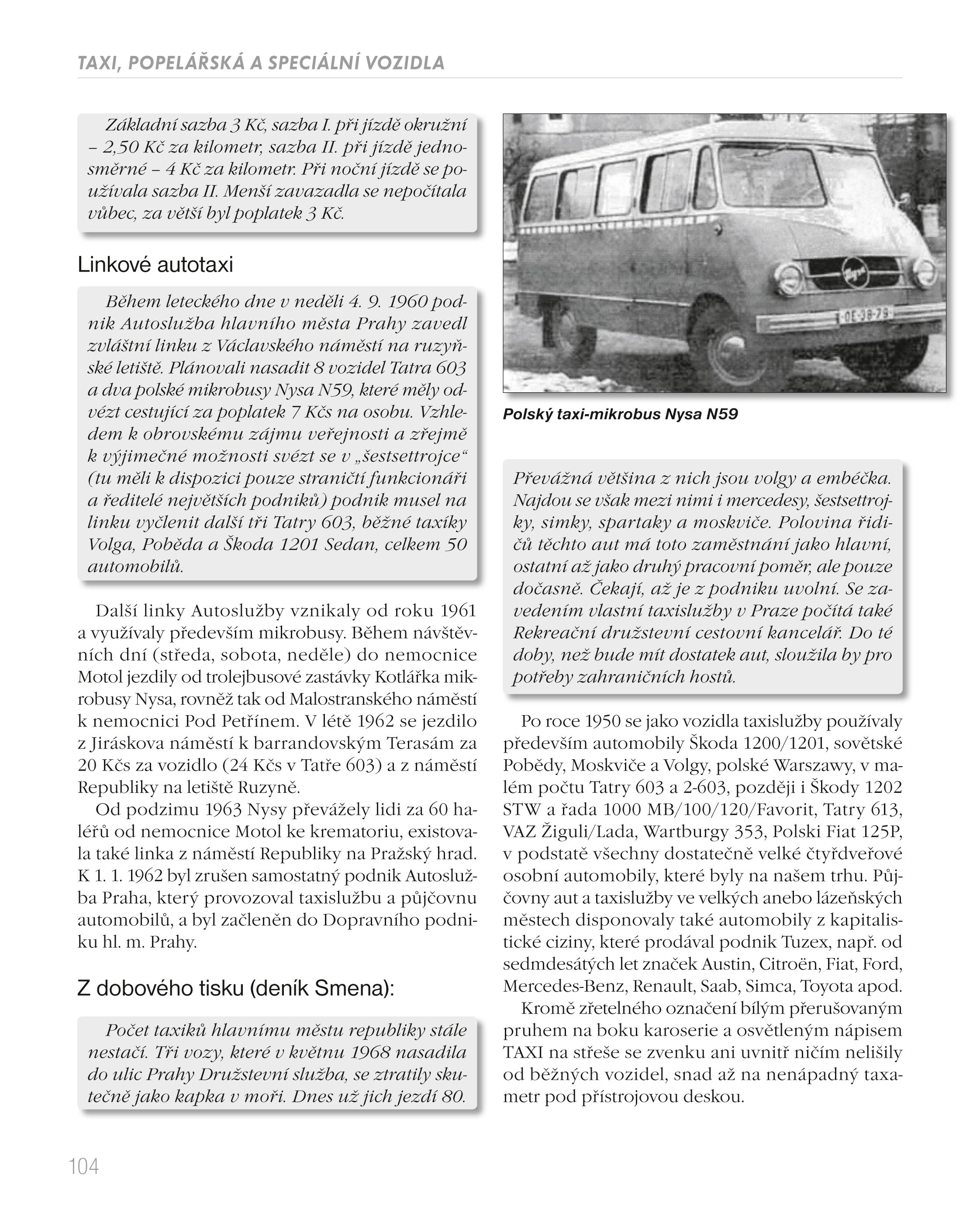 Kniha „Taxi, popelářská a speciální vozidla“ přibližuje čtenářům netradičním způsobem historii českých a slovenských komunálních vozidel od roku 1906 do současnosti a přináší podrobný přehled popelářských vozidel, československých taxíků, pohřebních vozidel, kropicích, zametacích a fekálních vozů i dalších víceúčelových automobilů a speciálních nástaveb. Součástí knihy je mnoho historicky vzácných fotografií, ilustrací a ukázek starých reklam.