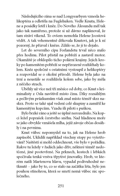 Skupina turistů se účastní okružní plavby kolem Špicberského souostroví. Loď přes přísný zákaz zastaví u výběžku, kde se nacházejí staré náhrobky Holanďanů. V otevřeném hrobě objeví zvědaví turisté kromě starých kosterních pozůstatků i mužskou hlavu. Hrůzný nález začne okamžitě vyšetřovat místní policie. Zdá se, že se na Špicberkách nikdo nepohřešuje. Případ se stane okamžitou senzací a na pomoc brzy přispěchají vyšetřovatelé z Osla. I pro ně však stále zůstává záhadou, komu hlava patří a jak se na tak liduprázdném místě vůbec ocitla. Zaměstnanec špicberského hejtmanství Knut Fjeld se nemůže smířit s tím, že byl případ odložen, a začne pátrat na vlastní pěst. Stopy zdánlivě neřešitelného případu postupně ukazují pouze na jednoho pachatele. Knut musí sebrat veškerou odvahu, aby své podezření dokázal. Nezbývá než se postavit vrahovi tváří v tvář…