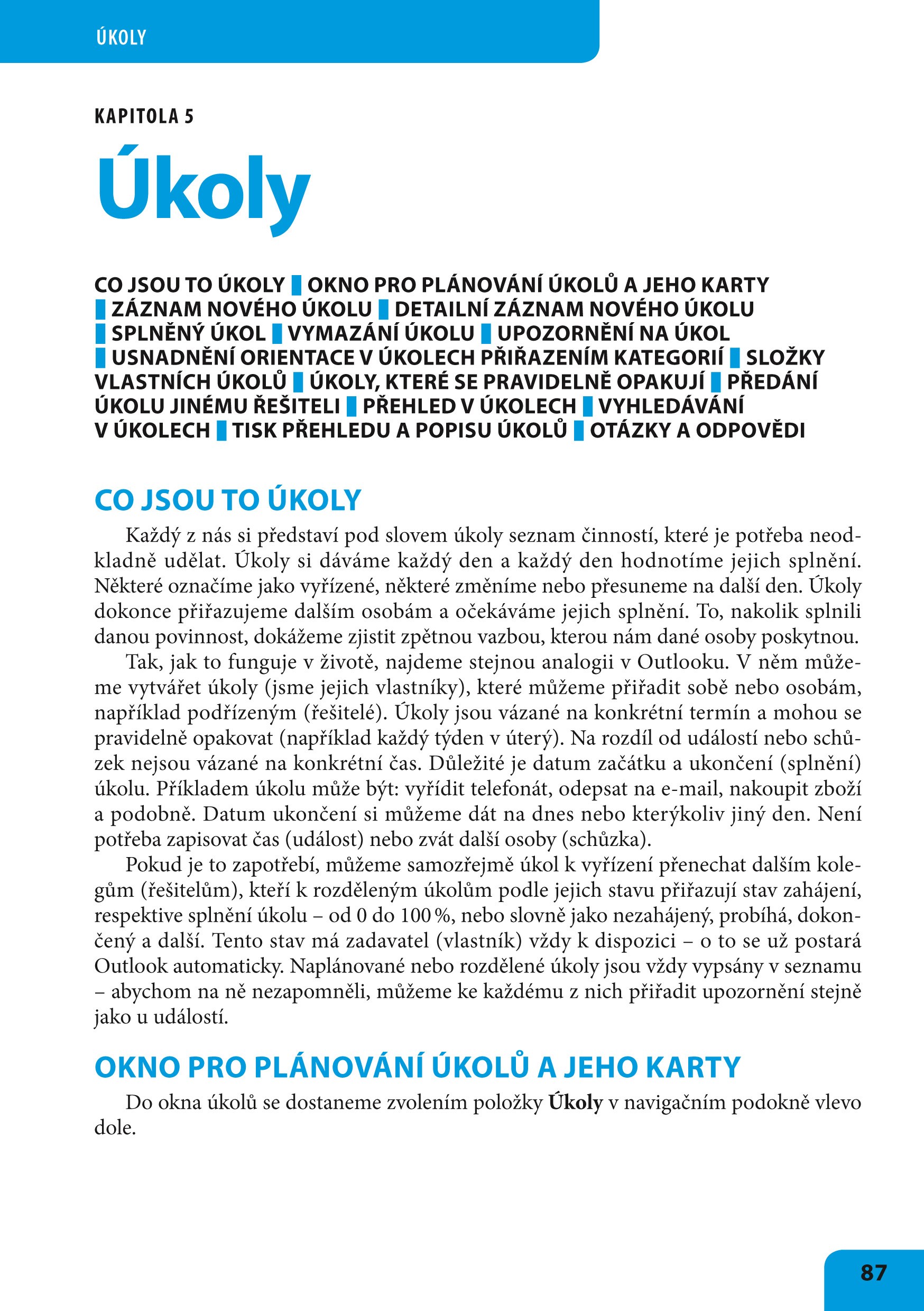 Autor vám v sedmi tematických kapitolách předvede všechny postupy, které potřebujete k tomu, abyste mohli přijímat a odesílat elektronickou poštu, přidávat události a upozornění do kalendáře, spravovat kontakty a vytvářet poznámky a úkoly. Tedy prakticky vše, co Outlook 2013 umí.