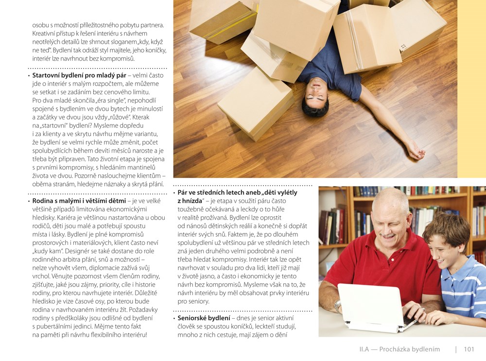 V první části knihy seznamují autoři čtenáře s obecnými znalostmi, které by si měl každý designér osvojit, ve druhé části pak ukazují, jak tyto principy aplikovat při návrhu jednotlivých místností v bytě. Provedou vás cestou od hledání konceptu a inspirace až po znalosti materiálů, technického kreslení, skicování, plánování prostoru a konstrukce nábytku, naučí vás pracovat s barvami, textilem a dekoracemi v interiéru a poskytnou vám rady pro počítačové projektování a výběr vhodného softwaru pro zpracování dokonalé vizualizace. Závěr první části je věnován budoucím bytovým designérům, kteří dostanou řadu doporučení, jak úspěšně nastartovat svoji novou kariéru. Druhá část knihy vás velmi podrobně provede každou místností v bytě. Autoři vás upozorní nejen na běžné situace a zásady, ale nabídnou i řešení mnohých úskalí při navrhování interiéru. Formou krátkých tipů vás pobídnou k jinému úhlu pohledu na běžně zažité stereotypy.