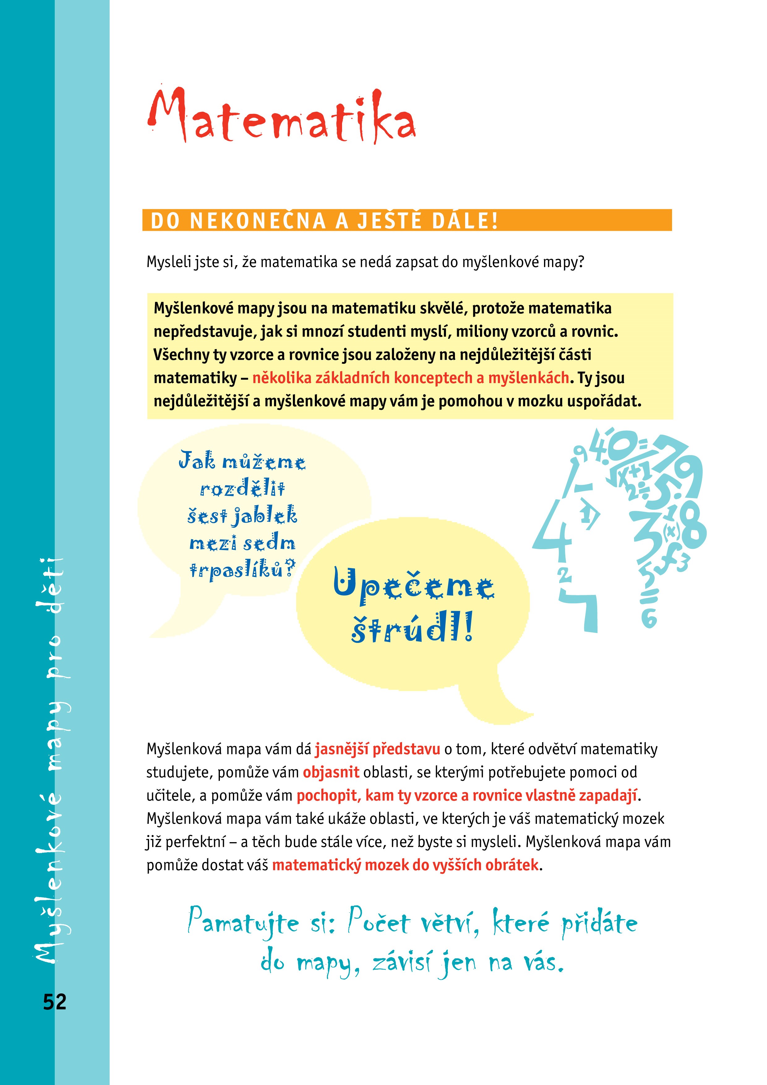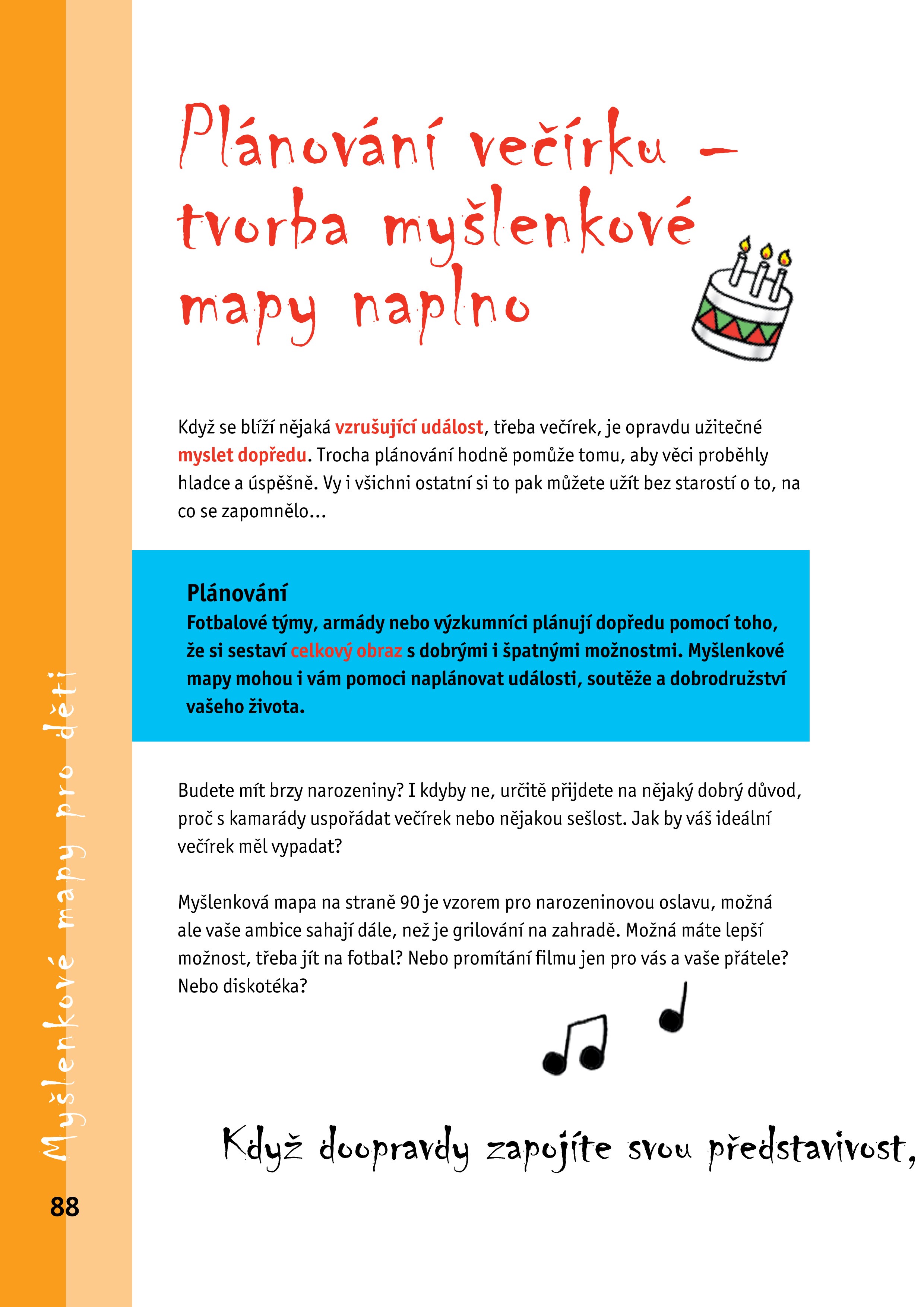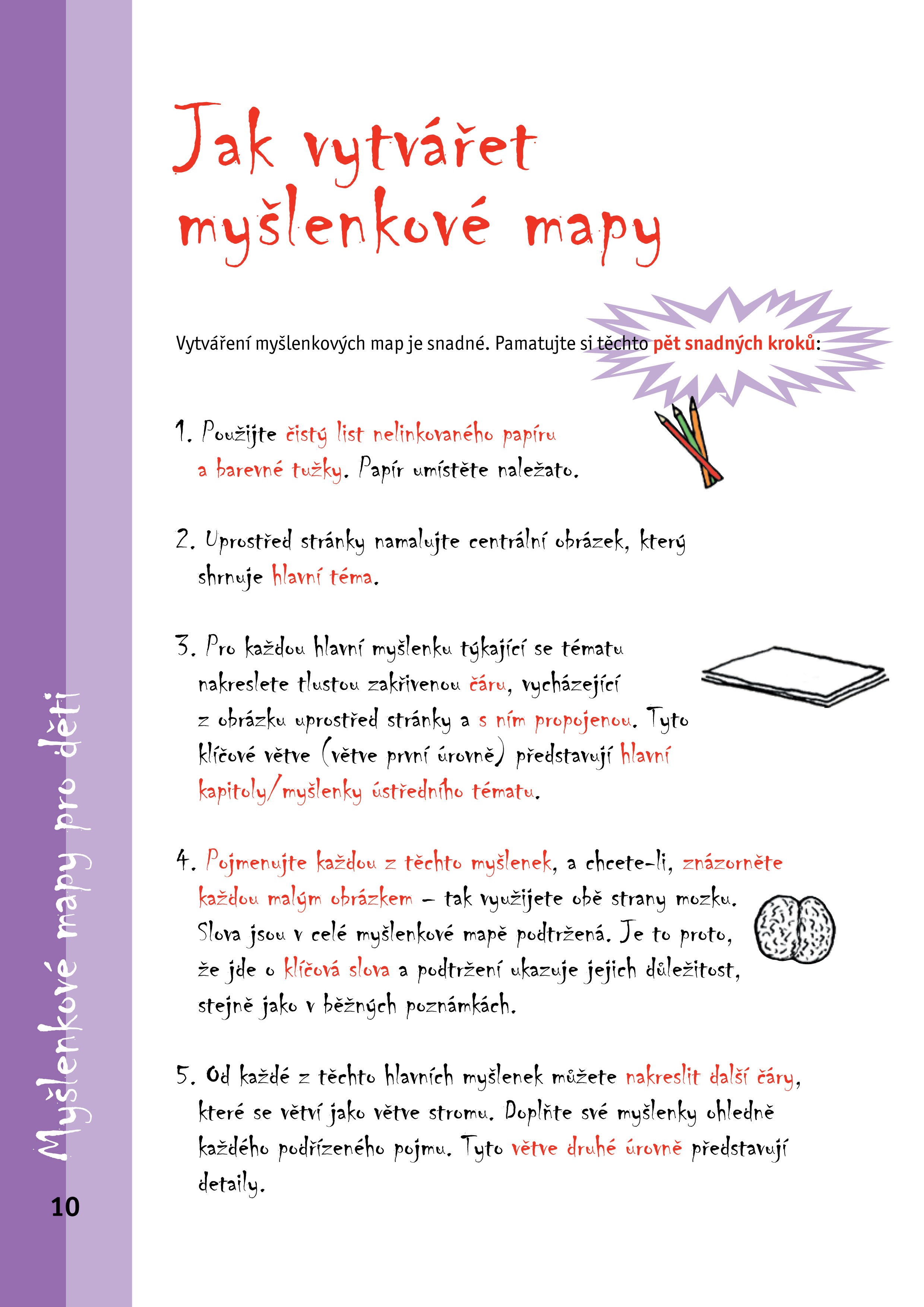 Metoda myšlenkových map dětem pomůže zefektivnit psaní poznámek a učení, zkrátit dobu strávenou nad domácími úkoly, rozvíjet kreativitu a představivost, zlepšit paměť. Naučí se nejen zefektivnit práci do školy, ale třeba i jak naplánovat narozeninovou oslavu, aniž by na něco zapomněly, nebo jak napsat dopis.