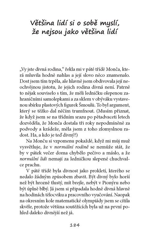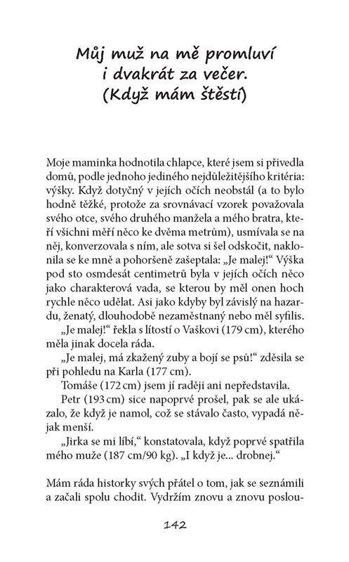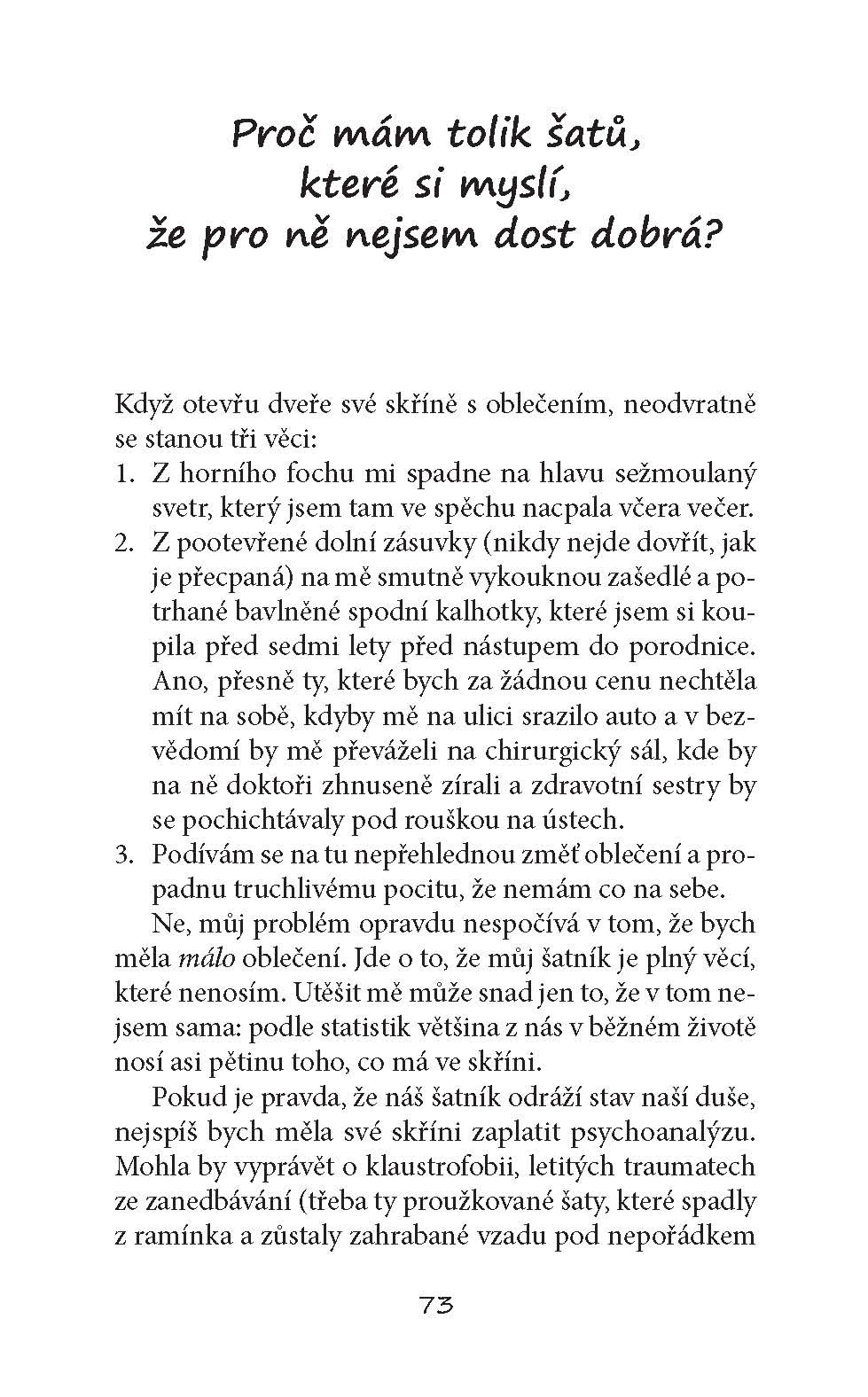 Ale jak to udělat? Odjet meditovat do Indie? Chovat bio ovce na Šumavě? Zachraňovat děti v Africe? Pracovat v baru na středomořské pláži? Taky mě to napadlo, ale, upřímně řečeno... nechtělo se mi. Místo toho jsem vyzkoušela různé způsoby, jak být šťastnější, a přitom si nechat svůj život takový, jaký je: s manželem a dvěma dětmi, s bytem na hypotéku a normální pracovní dobou. Tak například jsem zjistila, že bych určitě byla daleko šťastnější, kdybych nenosila boty, které mě tlačí, nemusela pokaždé hodinu lovit v kabelce, když mi zazvoní telefon, a neměla skříň nacpanou oblečením, které nenosím. Objevila jsem spoustu věcí, které mi dělají radost, i když tak na první pohled nevypadají: deštivé léto, zavařování povidel, vyhazování starých krámů, bobování s dětmi, ochutnávání podezřelých exotických jídel, počítání komářích štípanců a běhání (i když se mi nechce). A především jsem zjistila, že štěstí si nesmíme schovávat na Vánoce, na dovolenou nebo na někdy jindy. Nedělejte to tedy ani vy a zkuste být šťastní hned teď.