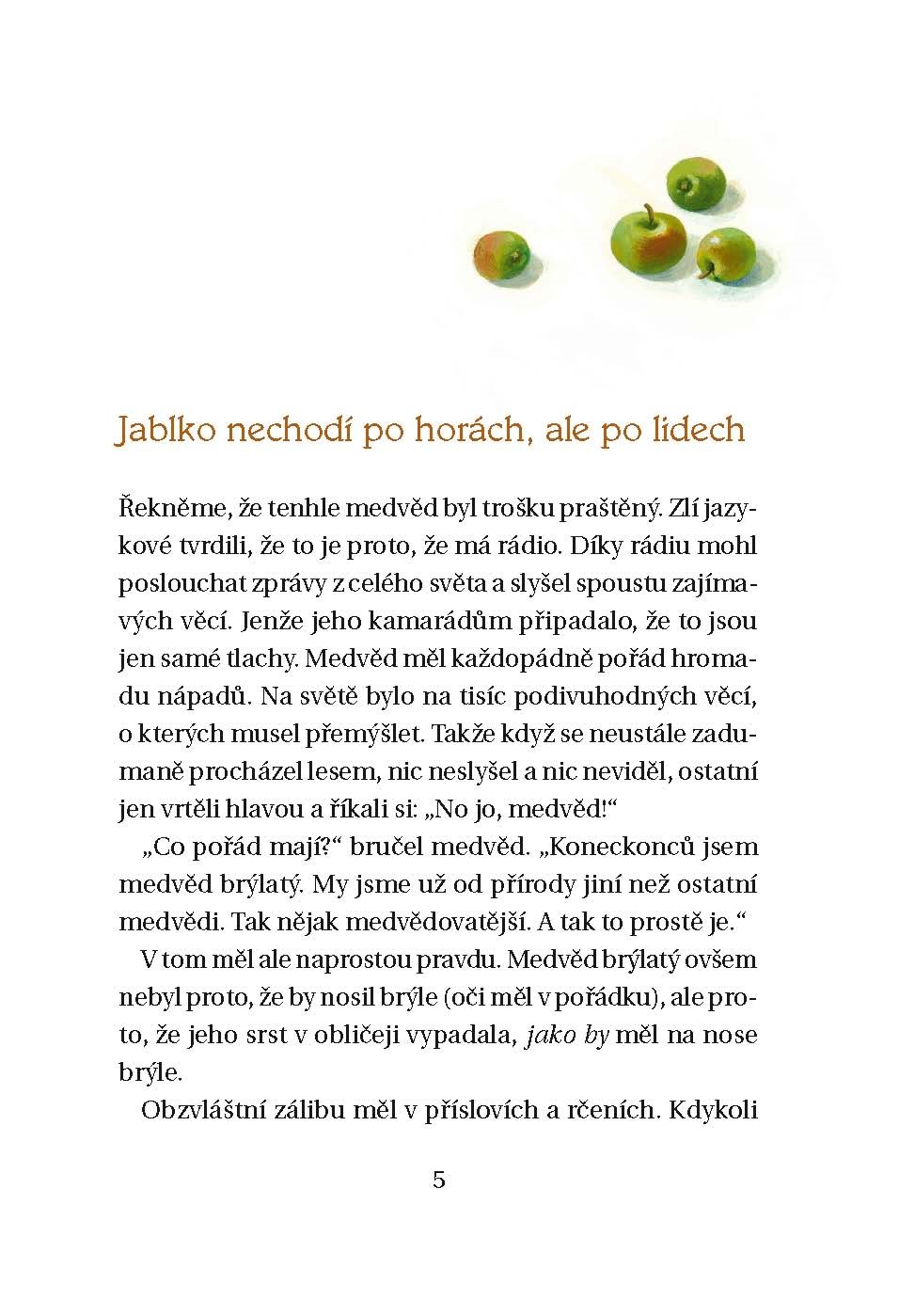 Medvěd brýlatý žije sám v malém srubu v lese, umí číst a psát a rád poslouchá rádio. A taky je vášnivý odborník na přísloví. Píše si je na malé kousky papíru, má jich stovky. Ne vždy ale ví, co které znamená, a někdy je trochu zmatený. Ale co na tom záleží, věty jako „Jablko nechodí po horách, ale po lidech“ zní přece skvěle! Ve vzrušujícím medvědově životě se toho děje spousta: potká kouzelníka, učí se létat a zjistí, co je to takový dekanečník. Všechno se ale změní jednoho dne, kdy se objeví medvědice, a brýlatá k tomu. Jestlipak bude chtít s medvědem zůstat v jeho chaloupce?