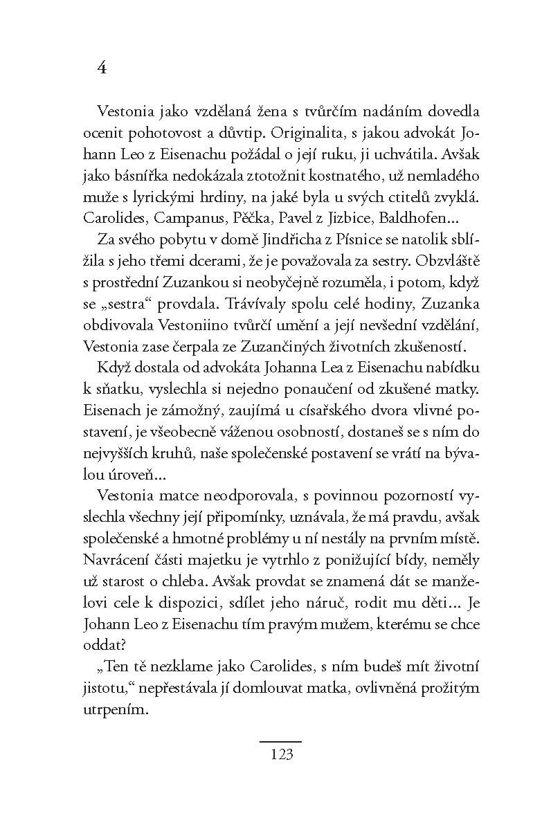 Elisabeth Westonová, známá jako Vestonia, se narodila v Anglii, ale většinu svého života strávila v rudolfínské Praze, kam přišla se svým nevlastním otcem, slavným alchymistou Edwardem Kelleym. Spolu s ním pak zažila vzestupy a pády, podle toho, zda se Kelley zrovna těšil přízni vladaře, nebo byl v nemilosti. Již od dětství se u ní projevovalo výrazné básnické nadání, které se rozvinulo zejména po Kelleyho smrti. Její latinsky psané básně vycházely nejen v Čechách, ale i za hranicemi, jejími přáteli byli významní humanističtí básníci po celé Evropě. Její verše zaujaly i císaře Rudolfa. Byla nazývána desátou Múzou, čtvrtou Grácií, divem světa, ženským Ovidiem, nejučenější ženou století. Jen v lásce se jí štěstí vyhýbalo, básník Carolides, do něhož se zamilovala již jako malá holčička, se oženil s jinou. Přesto však Vestonia nakonec rodinné štěstí našla…