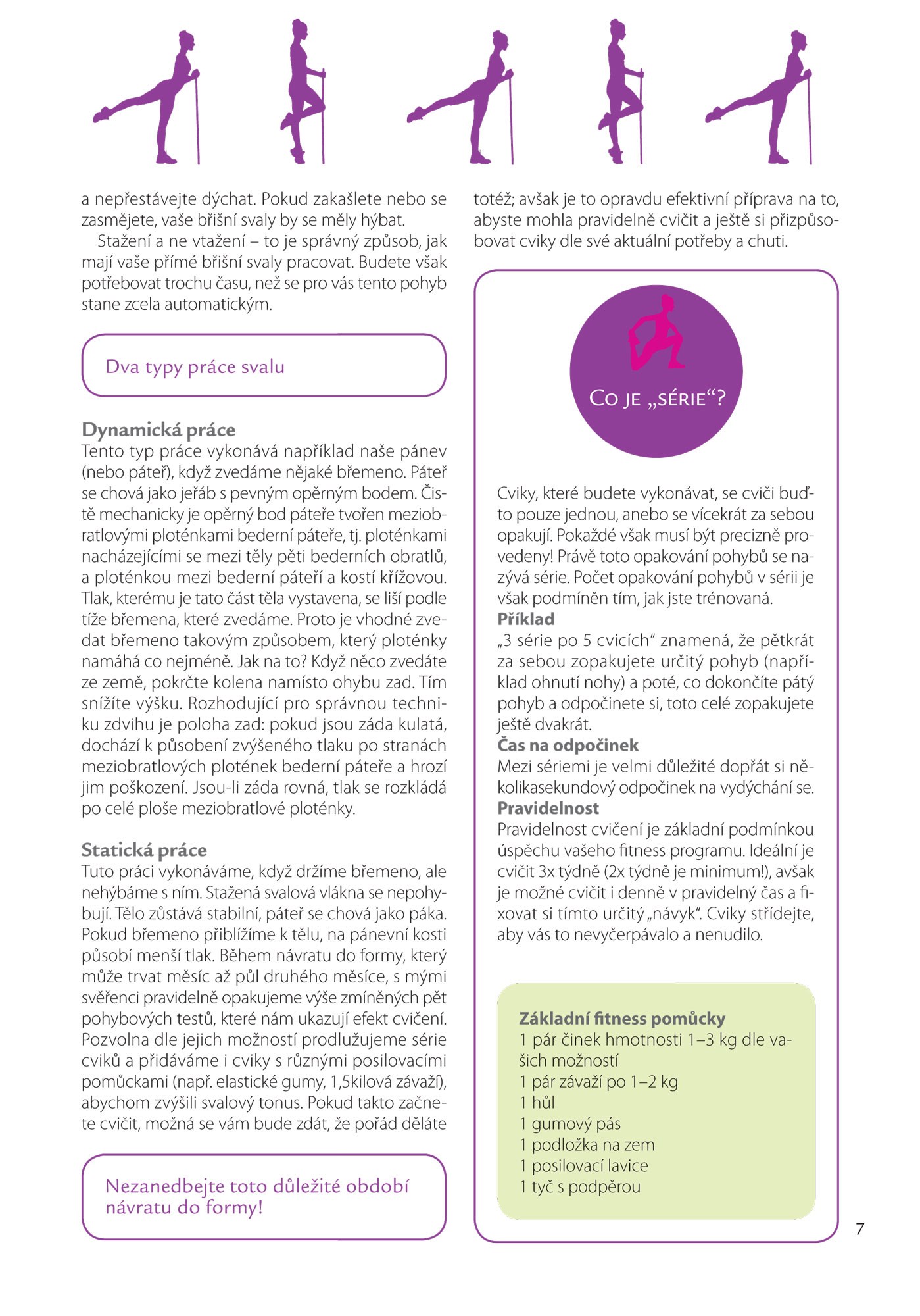 * Barevné odlišení cviků pro jednotlivé části těla, abyste mohla cvičení přímo zaměřit na problematické partie.