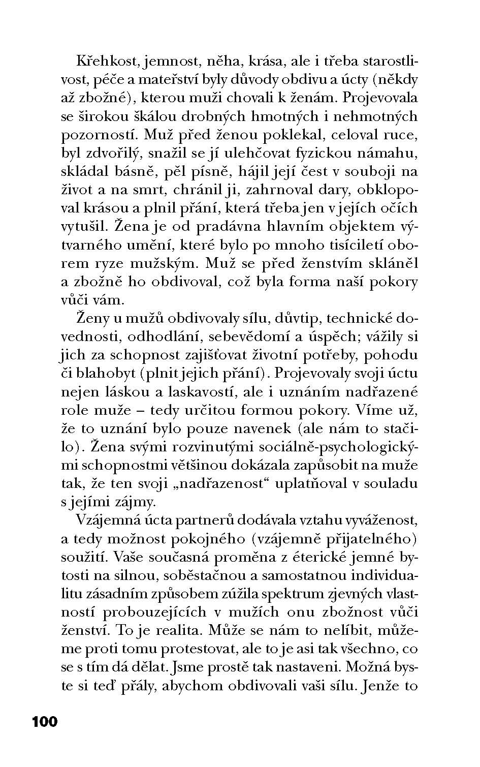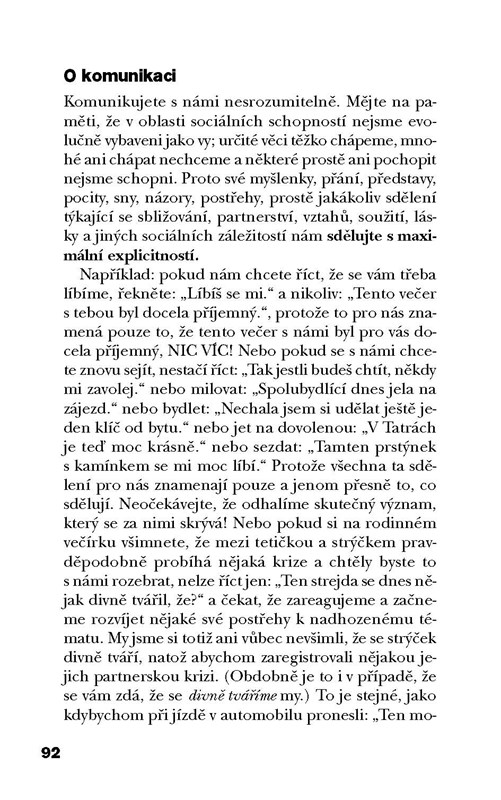 Taky se vám zdá, že muži mluví jazykem jiného kmene? Jste úspěšná, schopná, sebevědomá a pohledná žena, ale na toho muže s velkým M ne a ne narazit? Právě vám je tato útlá knížka určena. Tak odhoďte předsudky, zapomeňte na rady z ženských časopisů a seznamte se s mužským pohledem na věc!
