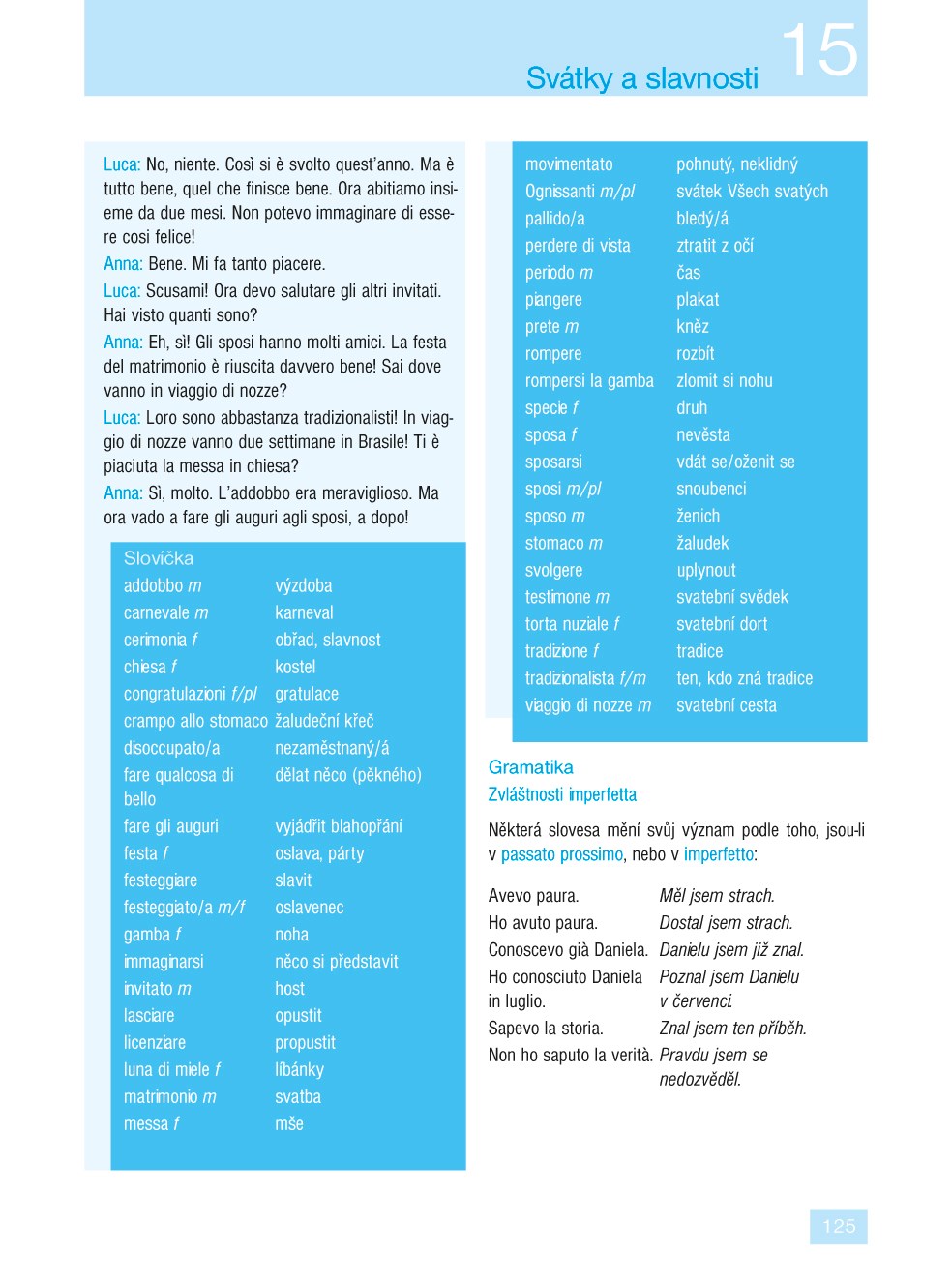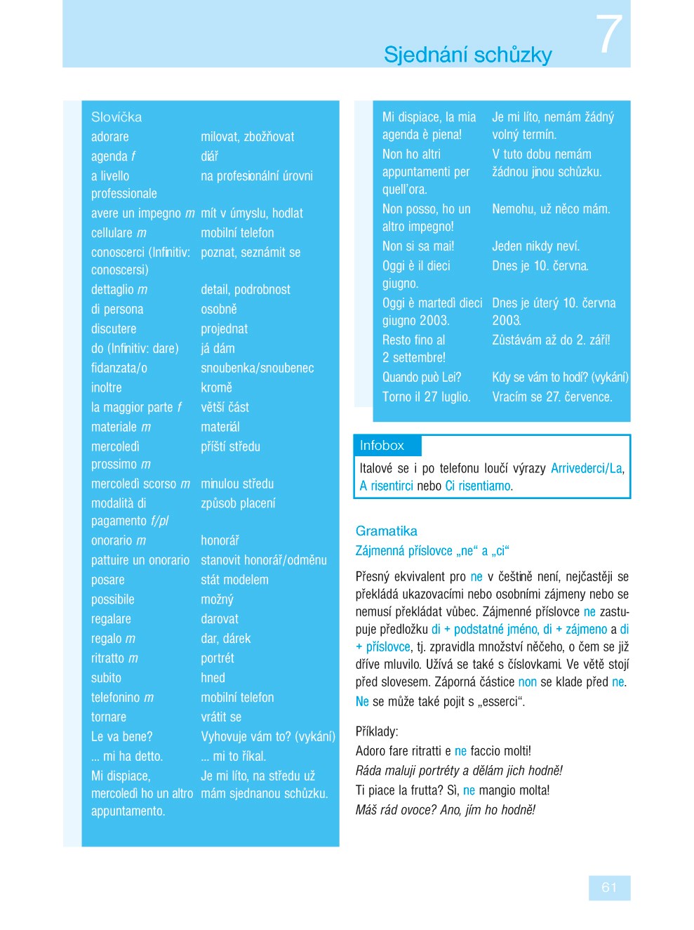 Ve 24 lekcích se naučíte základní gramatiku a osvojíte si slovní zásobu potřebnou v běžné komunikaci. Díky rozmanitým textům přibližujícím obvyklé situace (na nádraží, v hotelu, na nákupu, u lékaře, v bance, s přáteli) budete vědět, jak v dané chvíli reagovat. V infoboxech pak budete průběžně seznamováni s jazykovými zvláštnostmi, místními reáliemi a způsobem života v Itálii. Samozřejmostí jsou také rozmanitá cvičení, díky kterým si lehce zopakujete to, co jste se již naučili.