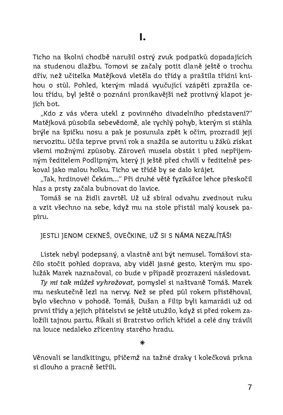 Tomáš a jeho kamarádi zbožňují landkiting, jízdu na prkně za tažným drakem. S kamarády si říkají Bratrstvo orlích křídel, snad jako by tušili, že je jejich záliba přivede na stopu pašeráků vzácného ptactva. Začíná dobrodružný příběh plný záhad a napětí, ale taky otázek. Rukopis knihy zvítězil v literární soutěži nakladatelství Albatros o nejlepší původní dobrodružný příběh pro děti v roce 2013.