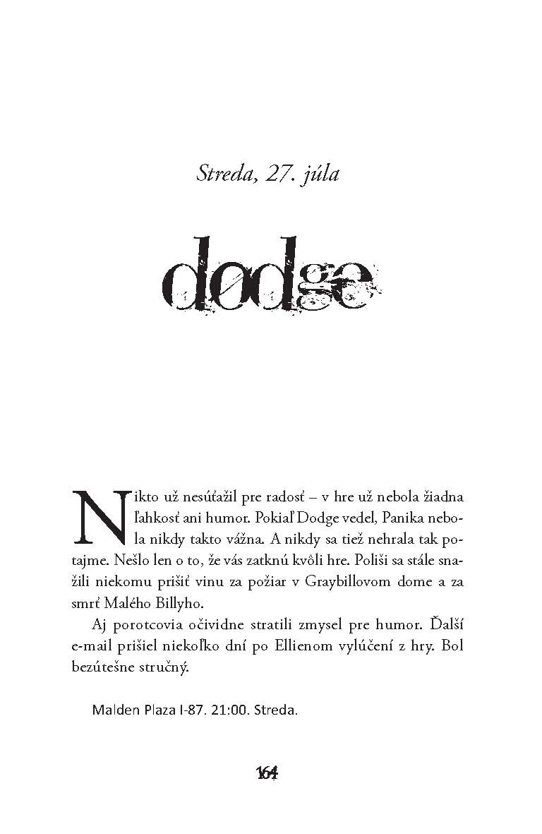 Panika začala v Carpe, nudnom zapadákove uprostred ničoho. Pravidlá sú celkom jednoduché – hlavne nemať strach. Heather by nikdy predtým nenapadlo, že by sa do Paniky púšťala. Pretože sa nikdy nepovažovala za nebojácnu a ani nebola ten typ dievčaťa, ktoré by na seba pútalo pozornosť. Dodge sa Paniky nikdy nebál. Vpred ho poháňa tajomstvo, vďaka ktorému prechádza každým ďalším kolom s pocitom sebaistoty a je presvedčený, že vyhrá. Heather a Dodgeovi prinesie hra prekvapivé odhalenia...