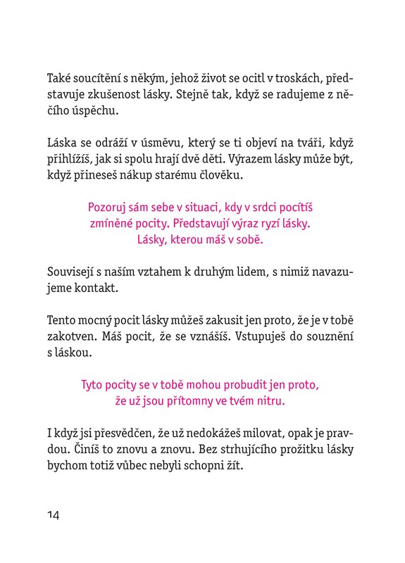 Pierre Franckh hravým způsobem představuje 6minutová cvičení, která nám umožní otevřít se naplňujícímu partnerskému svazku. Jsou úžasnou možností k tomu, abychom znovu nalezli štěstí v lásce. Nemusíte dělat nic zvláštního. Lásku si totiž nelze získat prací. Láska může jen jednoduše vzniknout. A vzniká neustále. Přesně vzato – je už s vámi. Každý den, každou minutu.