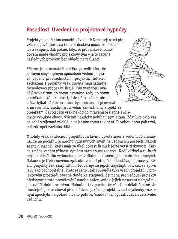 Projekt-Voodoo je zcela nová, inovativní strategie projektového managementu a vlastně i jeho zcela nový způsob myšlení. Kombinuje totiž poctivý projektový management s kreativními krizovými intervencemi a prvky systémového byznys koučinku. Projekt Voodoo navíc spojuje emocionální a kooperativní projektový management s klasickými metodami řízení. Zaměřuje se na těžkosti běžného projektového dne a umožní vám přivést všechny projekty k úspěšnému konci.